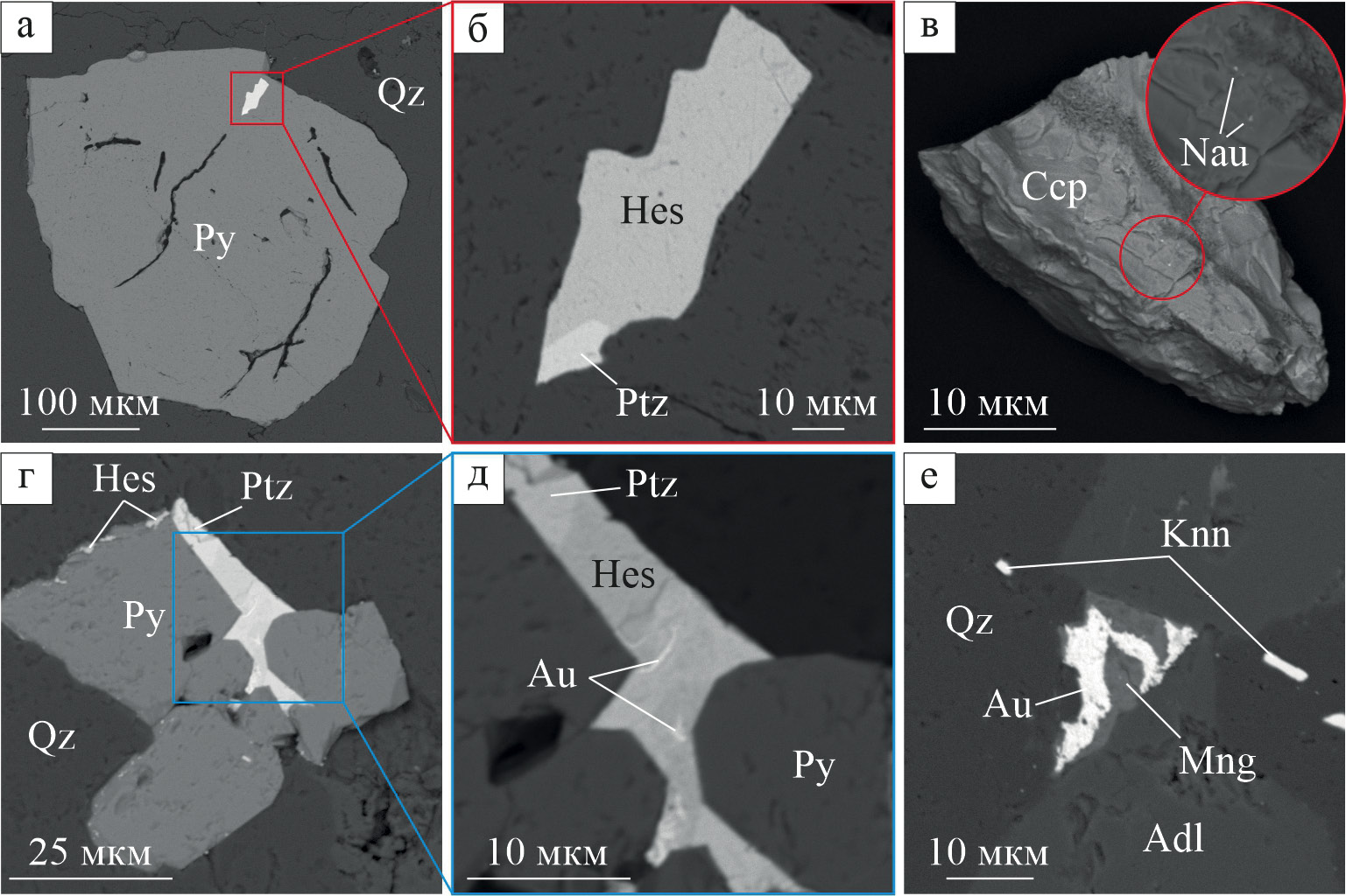 Рис. 5. Теллуриды и селениды золота и серебра участка Центральный (в, е) и участка Северный (а, б, г, д), изображения в обратно-рассеянных электронах. а, б – включения гессита (Hes) и петцита (Ptz) в пирите; в – включения науманнита (Nau) в халькопирите; г – срастание гессита, петцита и пирита; д – прожилки самородного золота в гессите; е – креннерит (Knn) в ассоциации с самородным золотом и гипергенными минералами марганца (Mng) в адуляр-кварцевой матрице (Adl).