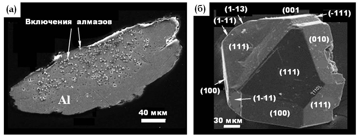 6. Fig. 5. A particle of natural duralumin with microinclusions of diamonds from explosive products of the Klyuchevsky volcano eruption (a) and a typical habitus of crystals in a spinel double (b).