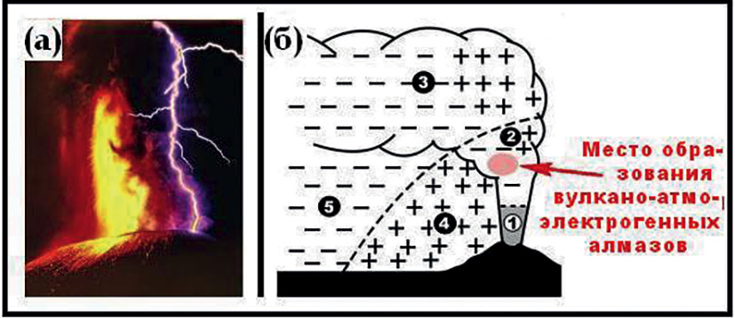Обобобщение полученных данных приводит к выводу о том, что все алмазы в вулканических эксплозиях по своим кристалломорфологическим и спектроскопическим свойствам практически тождественны, принципиально отличаясь при этом от кимберлитовых алмазов мантийного происхождения. Последнее располагает нас к отнесению такого рода алмазов к особенному генетическому типу [Карпов, 2018; Силаев и др., 2015а]. Нахождение охарактеризованных алмазов в рыхлых эксплозивных продуктах извержений вулканов в явной связи с вулканическими минерализациями приводит к выводу о том, что они являются результатом шок-стимулированной кристаллизации непосредственно в вулканическом пеплогазовом облаке вследствие атмосферных электрических разрядов (рис. 6). На этом основании такого рода алмазы могут быть определены по происхождению как вулкано-эруптивные или вулкано-атмоэлектрогенные2.