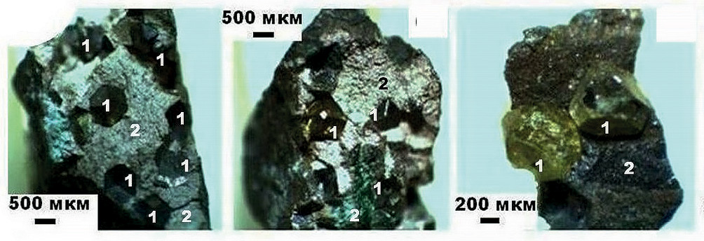 9. Fig. 8. Coalescence of diamonds (1) with kwansongite and polycomponent metal alloys (2) in “beans" from the Ozernovsky deposit.