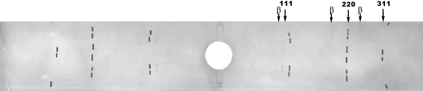 11. Fig. 10. Photorentgenogram of a diamond from the Ozernovsky deposit. The main reflections in the diamond structure have been recorded (d, Å): 2.051–2.052 (111); 1.255–1.26 (220); 1.073 (311); the parameter e. i. ao = 3.5592 ± 0.0002 Å.