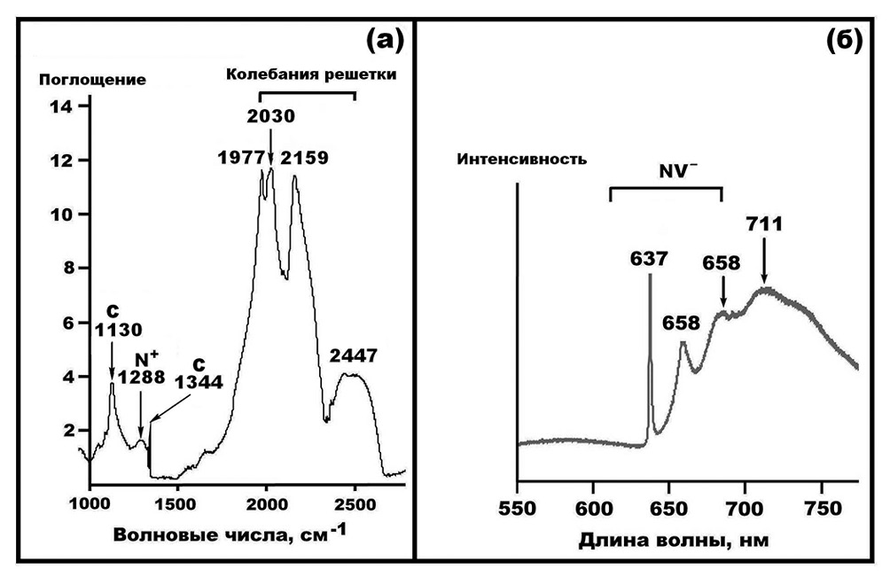 Исследованные кристаллы проявили желто-зеленую люминесценцию. В спектрах фотолюминесценции зафиксировались полосы безфононных колебаний с максимумами при 575 и 638 нм, которые приписываются простейшему азот-вакансионному (NV) центру – непосредственному производному С-дефектов соответственно в нейтральном и заряженном состояниях. Полосу с максимумом при 690–700 нм можно приписать никелевым центрам.