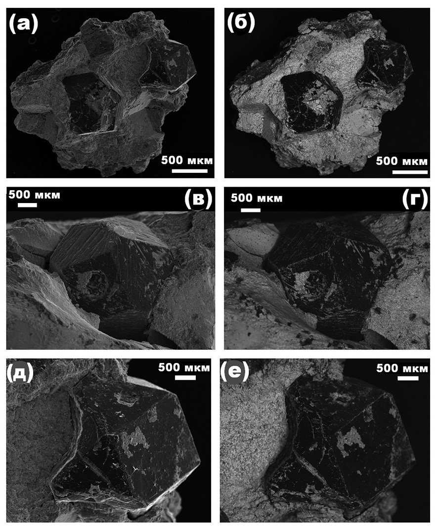 14. Fig. 13. Single crystals of Ozernov diamonds with xenomineral films (light) on the surface. SEM images in the modes of secondary (a, c) and elastically reflected (b, d) electrons.