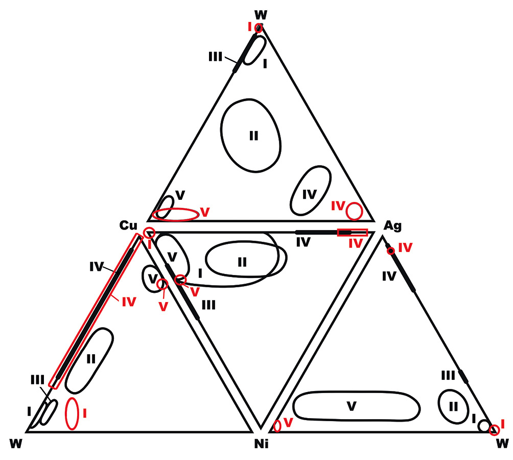 15. 14. Tetrahedral scan of compositions of polycomponent metal alloys in interstices (red fields) and on the surface of Ozernov diamonds. Alloys: I – copper-tungsten, II – copper-silver-tungsten, III – copper-titanium-tungsten, IV – tungsten-copper-silver, V – tungsten-nickel-copper.