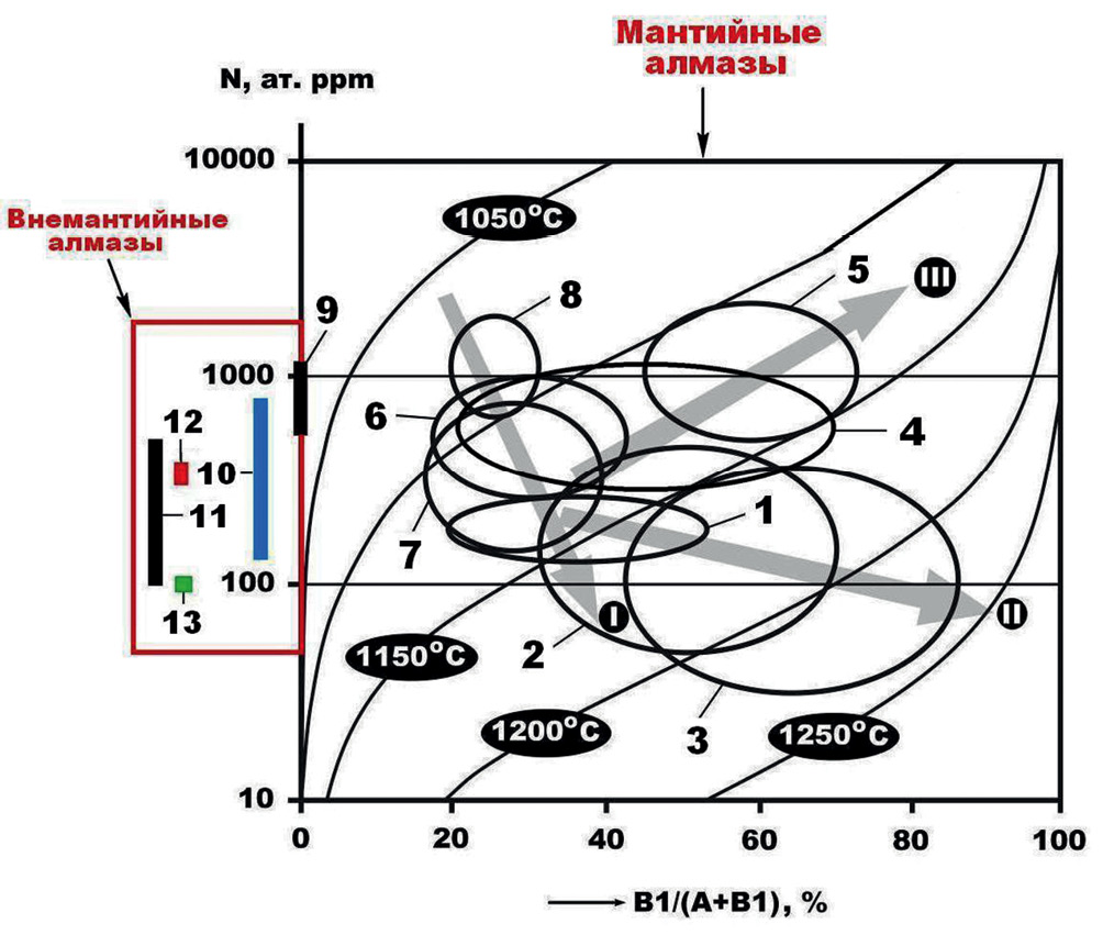 Рис. 16. Генеральная диаграмма азотных дефектов в природных алмазах, отражающая корреляцию степени агрегации в них азотных структурных дефектов с температурой посткристаллизационного отжига. 1–8 – алмазы, претерпевшие мантийный отжиг: 1 – кимберлитовые, Южная Африка (1), 2, 3 – бразильские монокристальные и микрополикристаллические (карбонадо) провинции, соответственно Минас-Жерайс (2) и Жуина (3), 4, 5 – туффизитовые, соответственно тиманские (4) и североуральские (5), 6 – кимберлитовые, Восточная Сибирь (Якутия), 7 – кимберлитовые, Украина, 8 – кимберлитовые, Архангельская субпровинция; 9–13 – алмазы без признаков мантийного отжига: 9 – из Кумдыкольского месторождения, Северный Казахстан, 10 – камчатские вулкано-атмоэлектрогенные, 11 – из хромититов офиолитового массива Луобуза, Южный Тибет, 12 – из Енисейского кряжа, 13 – камчатские из Озерновского месторождения.