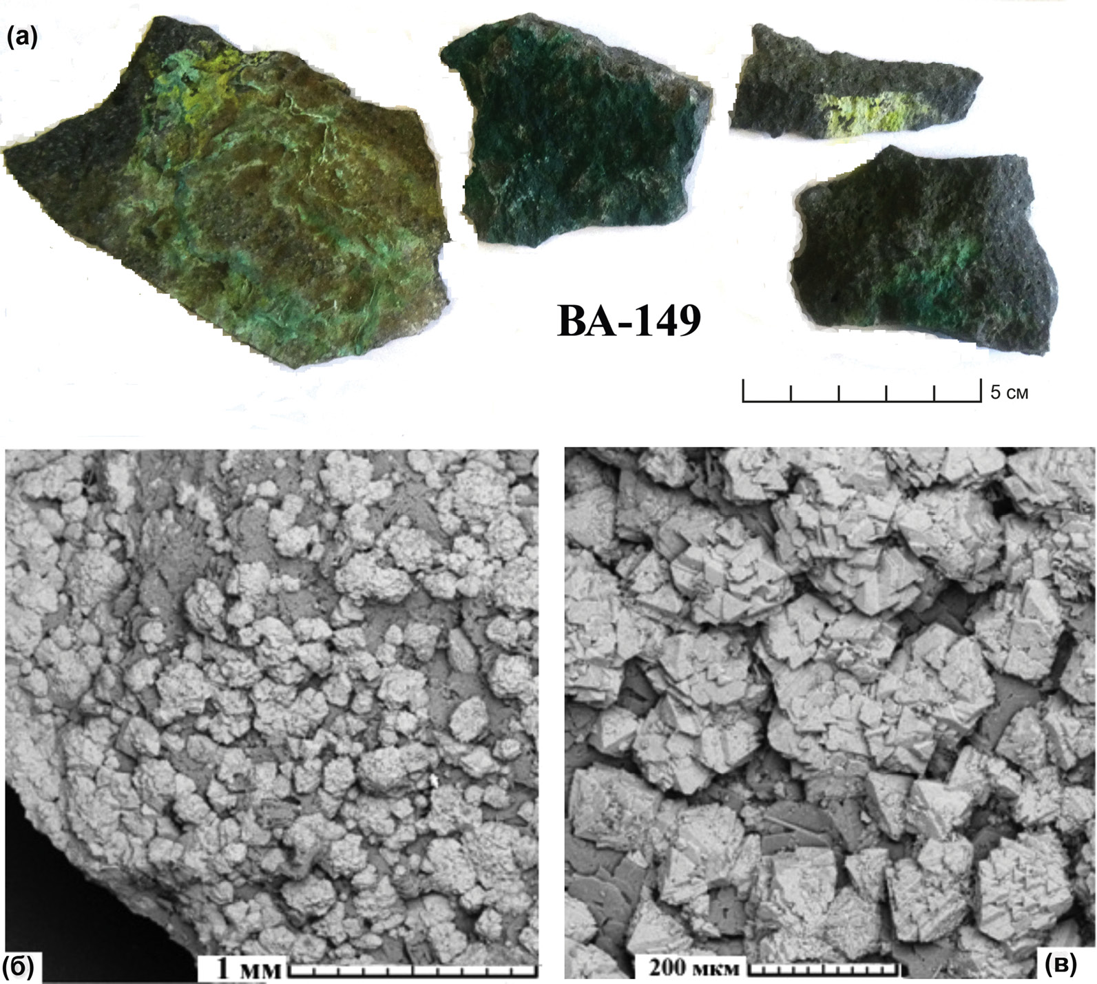 Возгоны вулкана Алаид детально изучались в лабораторных условиях [Житова и др., 2020, Петрова и др., 2019, 2020; Рашидов, Аникин, 2014, 2015, 2016, 2017, 2018, 2019, 2020а, 2020б; Рашидов и др., 2013; Силаев и др., 2021]. Отметим, что в возгонах со склонов вулкана Алаид были сделаны первые для КОД находки атакамита Cu2Cl(OH)3 [Рашидов, Аникин, 2016] и фольбортита Cu3V2O7(OH)2 × 2H2O [Житова и др., 2020].