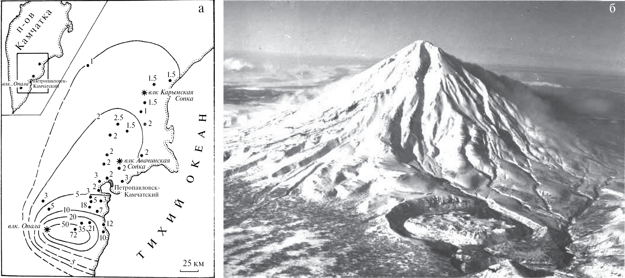Рис. 1. Карта изопахит (в см) пеплового горизонта ОП-1500 (а) и вид вулкана Опала (б). На переднем плане Бараний Амфитеатр, образованный при извержении ~1500 лет назад.