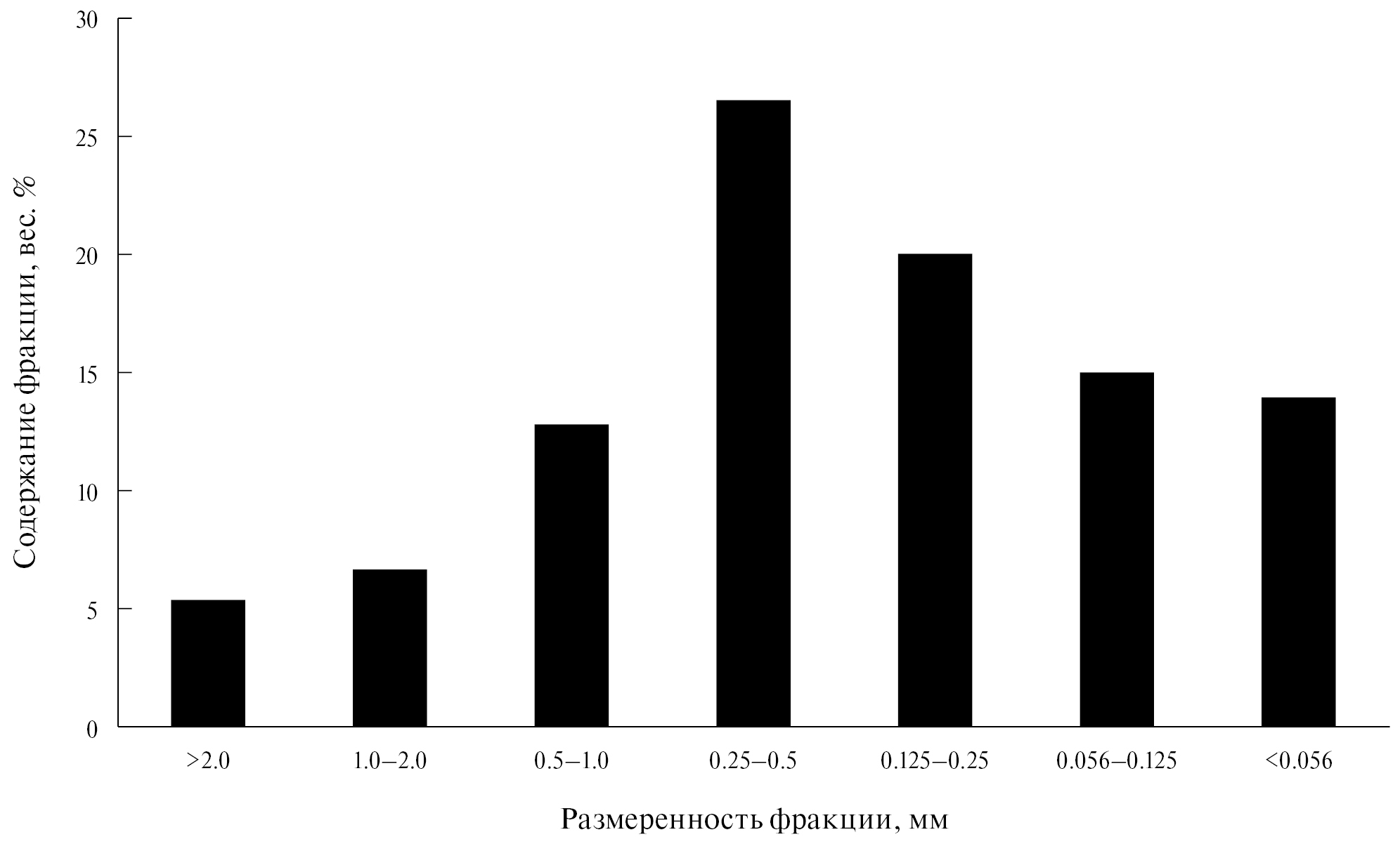 Для исключения влияния эоловой гравитационной дифференциации на распределение по размеру пепловых частиц проведена рандомизация результатов по гранулометрическому составу, полученных на различном расстоянии от центра извержения – от 5 до 250 км, всего 45 единичных определений гранулометрии на площади пеплопада ОП-1500. На основе полученной случайной выборки (15 определений) построена гистограмма содержания различных фракций в пепле извержения ~1500 л. н. (рис. 2), показывающая, что в пепловом материале преобладает фракция 0.25–0.50 мм, составляющая более 26% объема тефры.