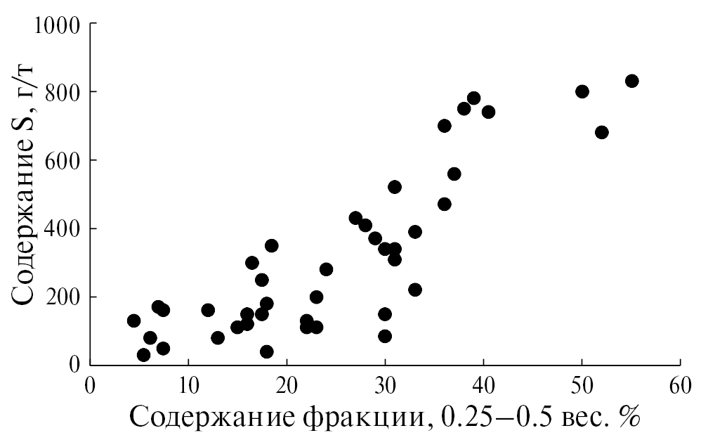 Содержание серы в изученных образцах пепла ОП-1500 составляет от 80 до 830 г/т при среднем значении 310 г/т (n = 45). Обнаружена связь между валовым содержанием серы и количеством частиц размером 0.25–0.50 мм в пробе (рис. 3). Взаимосвязи с содержанием других фракций и элементов (петрогенных и микроэлементов) не обнаружено. При содержании в пробе пепла указанной фракции более 50 вес. %, содержание серы в пробе составляет ~800 г/т, при содержании фракции 0.25–0.50 мм менее 15% содержание серы минимально (около 200 г/т). Дистальная тефра ОП-1500, состоящая преимущественно из частиц крупностью менее 0.125 мм, не показывает обогащение серой.