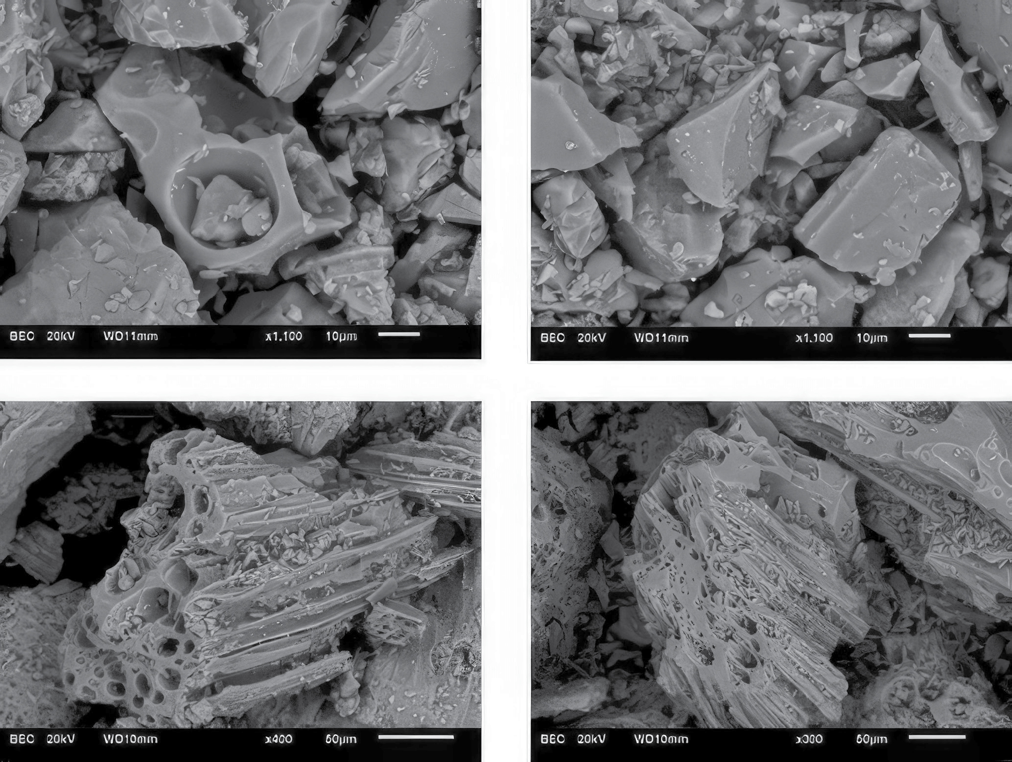 Рис. 4. СЭМ изображение пепловых частиц ОП-1500, место отбора пробы в 9.5 км от Бараньего Амфитеатра. Верхний ряд – фракция менее 0.056 мм, нижний ряд – фракция 0.25‒0.50 мм.