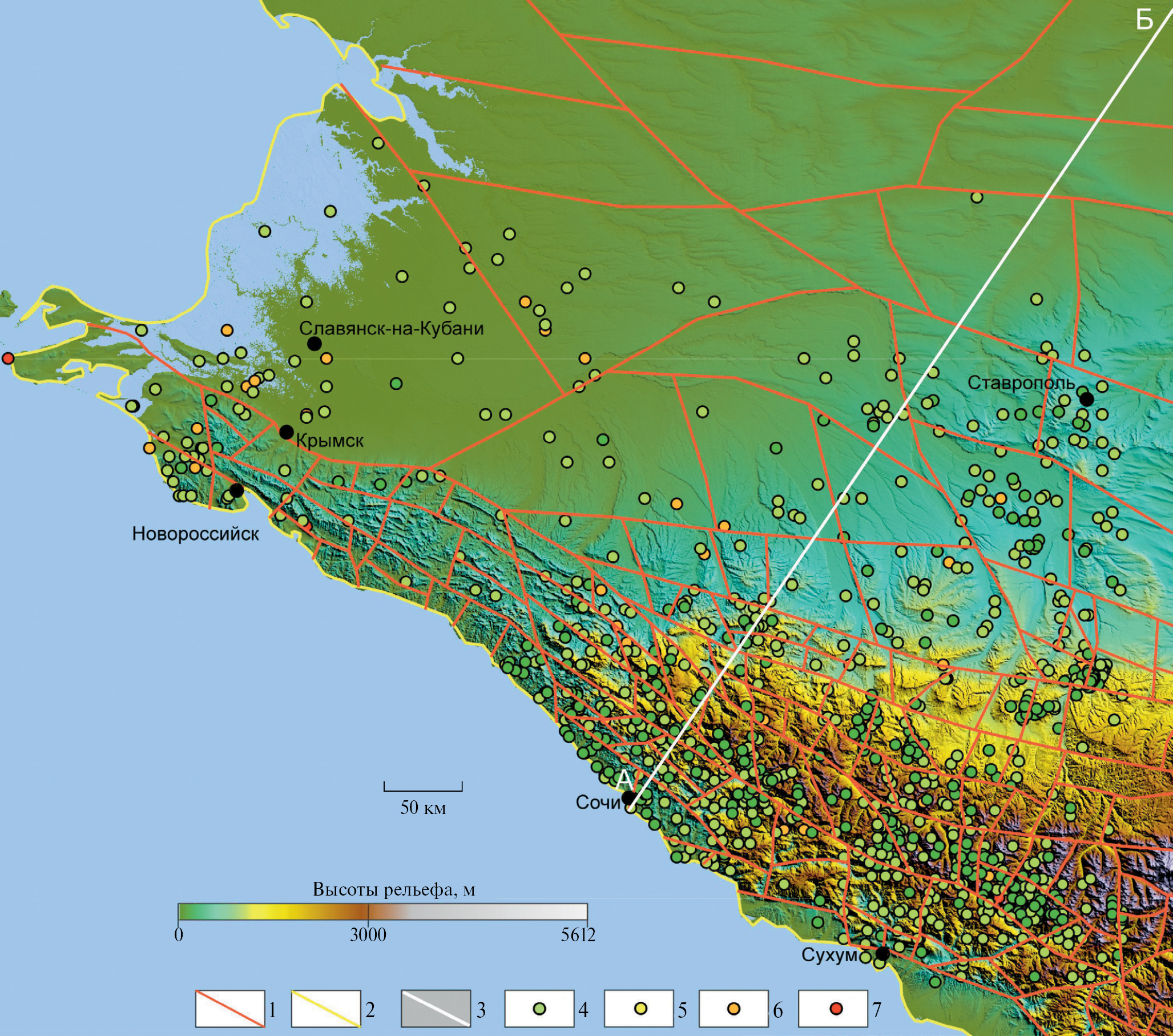 Рис. 1. Схема “слабых” зон Северо-Западного Кавказа. 1 – “слабые” зоны; 2 – контуры береговой линии; 3 – линия профиля; 4–7 – эпицентры землетрясений с магнитудой по поверхностным волнам (MS): 4 – <2; 5 – 2–4; 6 – 4–6; 7 – 6–7.2.