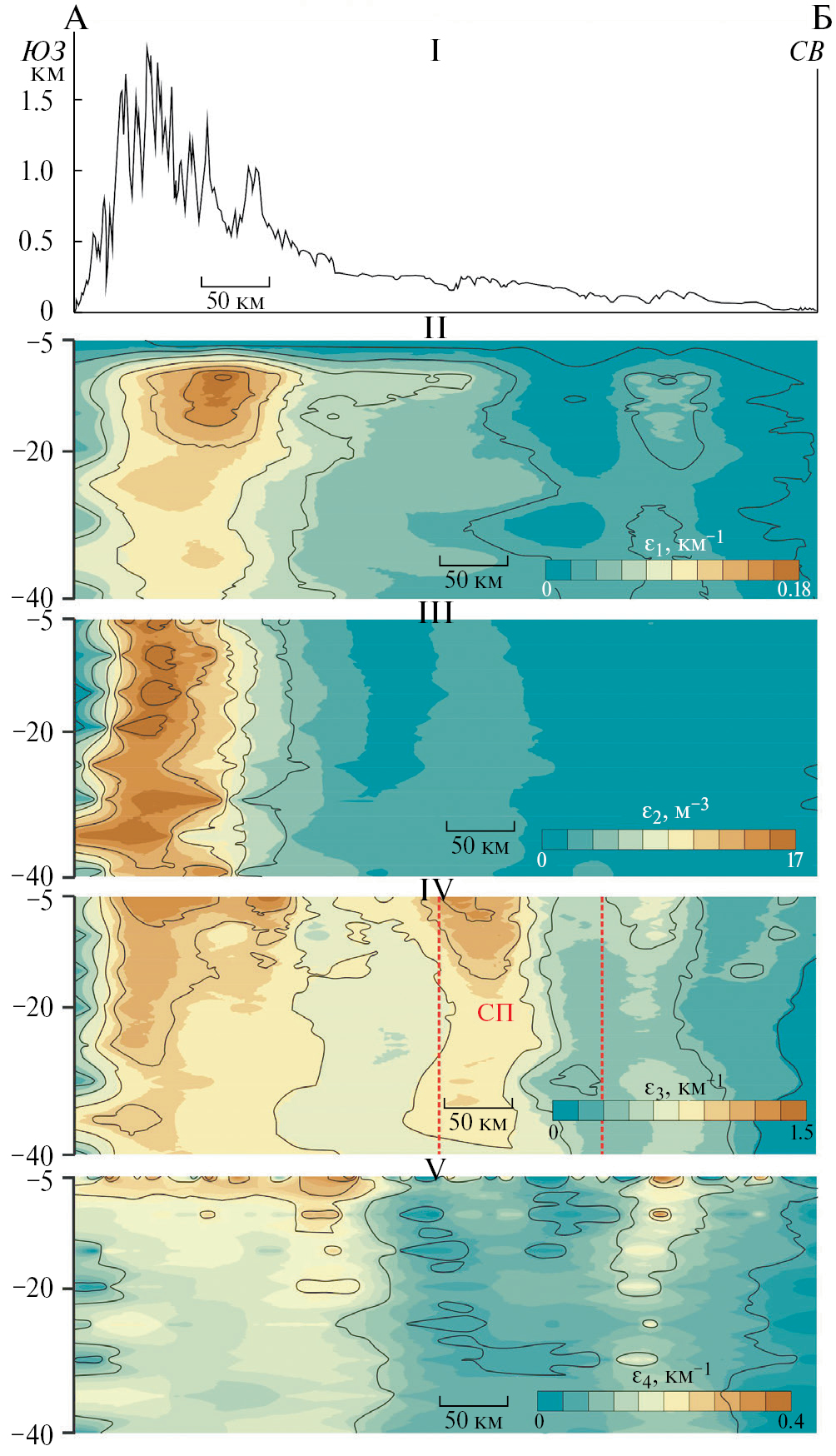Рис. 2. Профиль рельефа Северо-Западного Кавказа по линии А–Б (I) и вертикальные срезы поля тектонической раздробленности, оцененной по удельной длине “слабых” зон (II, шаг изолиний 0.03 км−1), кривизне рельефа (III, шаг изолиний 3 м−3), удельной длине линий вытянутости (IV, шаг изолиний 3 км−1) и водотоков (V, шаг изолиний 0.1 км−1). СП — Ставропольское поднятие, по [Милюков и др., 2022].