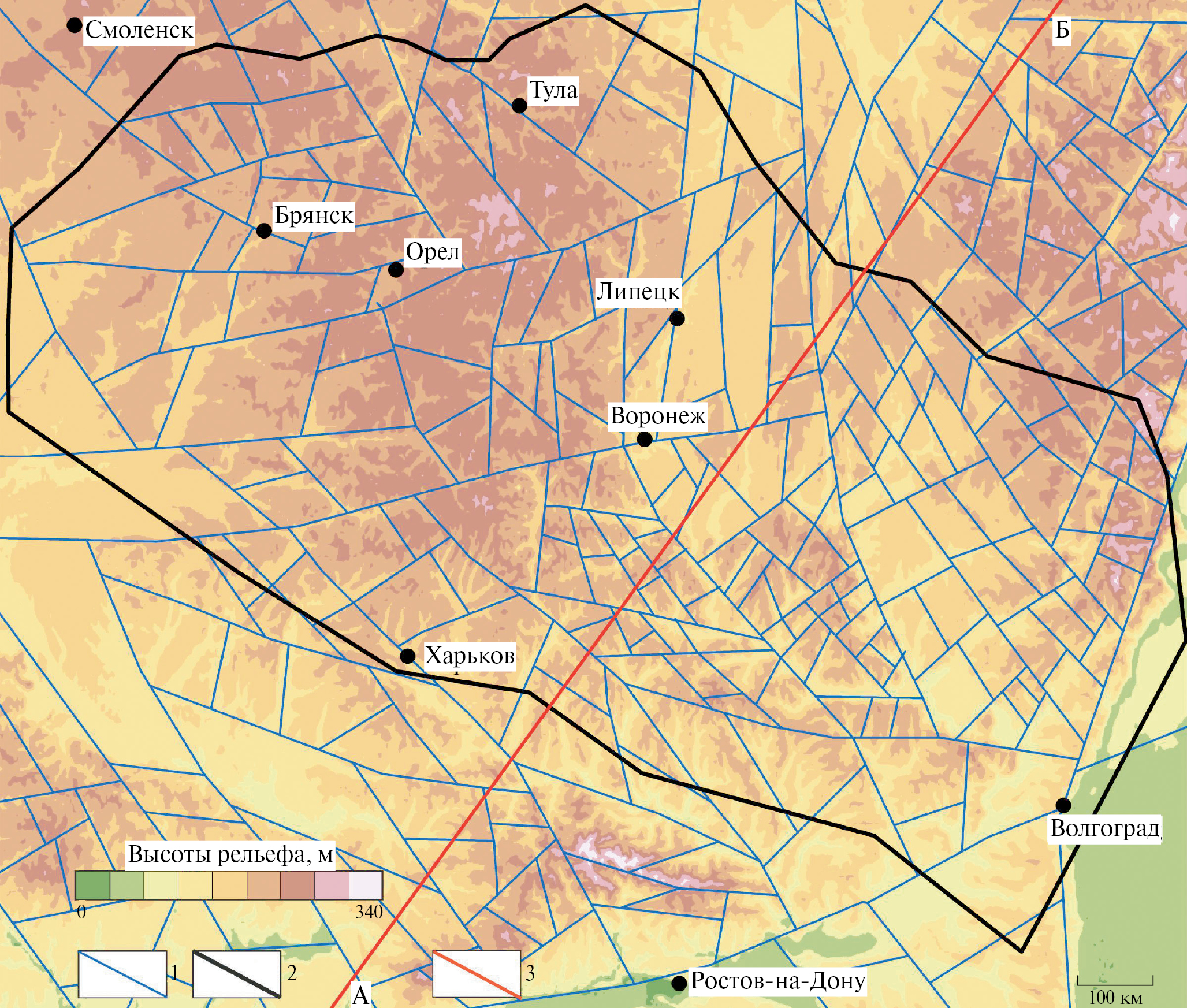 Рис. 3. Схема “слабых” зон Воронежской антеклизы. 1 – “слабые” зоны; 2 – границы антеклизы; 3 – линия профиля.