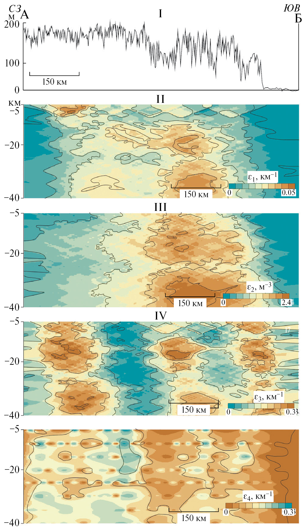 Рис. 4. Профиль рельефа Воронежской антеклизы по линии А–Б (I) и вертикальные срезы поля тектонической раздробленности, оцененной по удельной длине “слабых” зон (II, шаг изолиний 0.01 км−1), кривизне рельефа (III, шаг изолиний 6 м), удельной длине линий вытянутости (IV, шаг изолиний 0.1 км−1) и водотоков (V, шаг изолиний 0.1 км−1).
