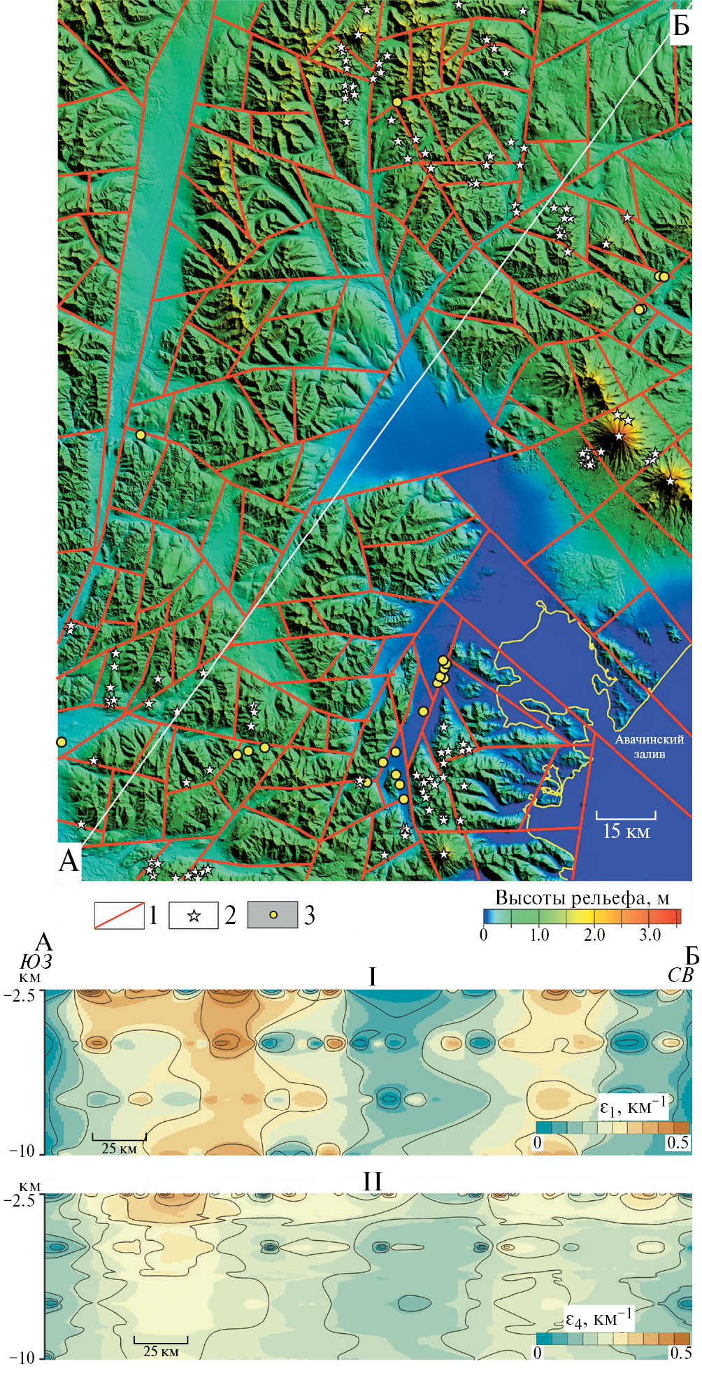 Морфометрический анализ рельефа показал, что параметры ε2−3 не информативны для понимания особенностей мегатрещиноватости МПЗ, поскольку ее рельеф во многом обусловлен вулканическими процессами, и линии вытянутости расположены концентрически вокруг стратовулканов – Авачинского, Корякского, Вилючинского, Бакенинг. К ним также приурочены наиболее крупные аномалии кривизны рельефа. В то же время структурно-геоморфологическое дешифрирование в масштабе 1:200 000 и расчет удельной длины водотоков по топографическим картам того же масштаба позволили выявить региональные зоны мегатрещиноватости, нередко связанные с долинами крупных рек – Малкинской, Авачи, Паратунки. По положительным аномалиям ε1 и ε4 выделены области повышенной трещиноватости в северо-восточной и юго-западных частях МПЗ, где расположено большинство моногенных вулканических построек, практически не выраженных на ЦМР, и термальных источников. Эти зоны хорошо прослеживаются на профилях (рис. 5) до глубины 10 км. Отметим высокую численную корреляцию между точечными элементами воксельных моделей, построенных по ε1 и ε4: коэффициент корреляции Пирсона равен 0.86 (N = 2388). Более подробно соотношение выделенных нами по геоморфологическим признакам двух областей повышенной трещиноватости с геологическим строением описано в статье [Агибалов и др., 2023].