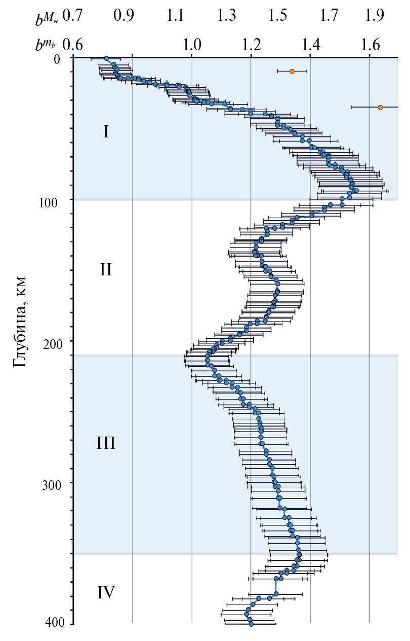 Исходя из тенденций изменения величины b с глубиной, выделены четыре интервала глубин (см. рис. 4), рассматриваемые ниже раздельно. Интервал I соответствует глубинам 0–100 км, II – 100–210 км, III – 210–350 км, IV – 350–400 км.