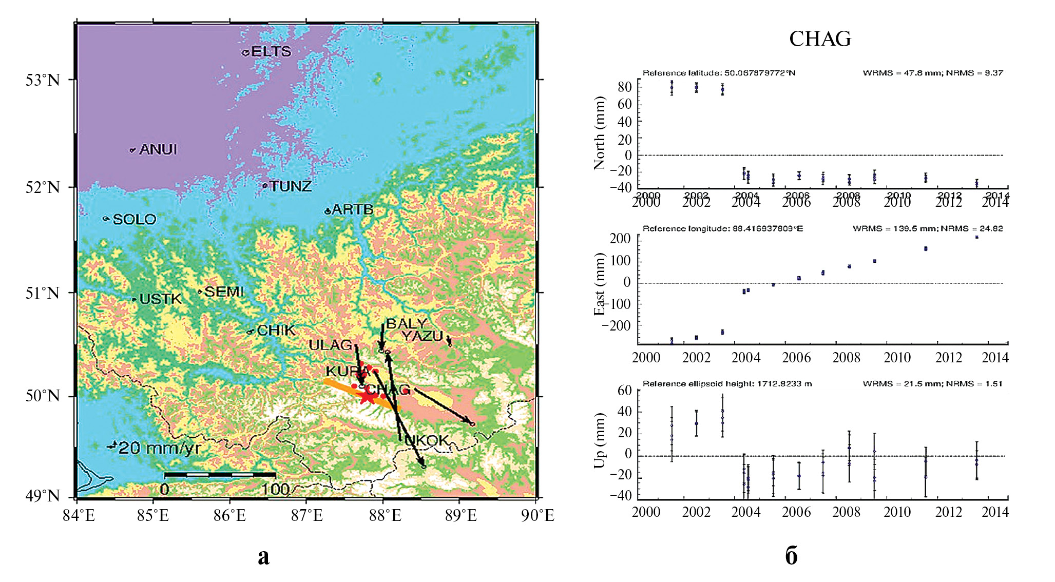 Примечание. * – пункты расположены на равнине, в отличие от остальных пунктов, расположенных в горной местности. Все величины, приведенные в таблице получены авторами, решение в международных центрах для пунктов URUM и LHAZ дают близки результаты, см. http://geodesy.unr.edu/NGLStationPages/stations/URUM.sta, http://geodesy.unr.edu/tsplots/IGS14/IGS14/TimeSeries/URUM.png, http://geodesy.unr.edu/NGLStationPages/stations/ LHAZ.sta, http://geodesy.unr.edu/tsplots/IGS14/IGS14/TimeSeries/LHAZ.png