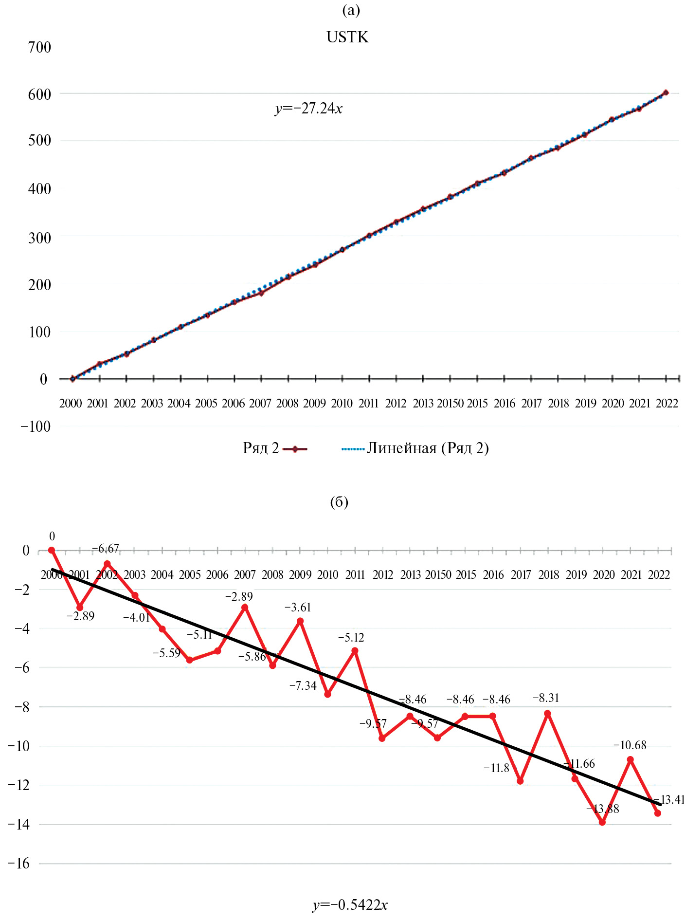 Рис. 7. Смещение пункта USTK (см. рис. 1) за период наблюдений 2000‒2022 гг. (в мм) по долготе (смещение на восток) (а) и по широте (смещение на юг) (б).