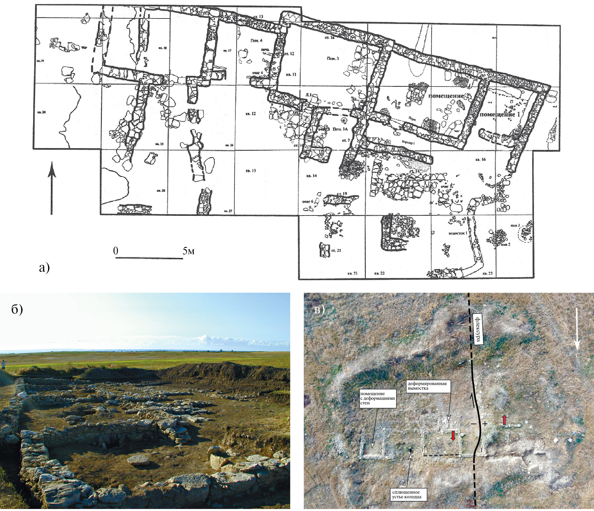Субмеридиональная плоскость отрыва этой оперяющей структуры пересекла древнее поселение приблизительно посередине, образовав видимую флексуру в “материке” археологического памятника. Сильные сейсмические подвижки из очага привели к обрушениям всех строительных конструкций и сильной деформации сохранившихся нижних рядов каменной кладки: наклонам, выдвижениям и разворотам частей стен. Учитывая близость сейсмического очага и сильнейшие разрушения всех построек поселения, мы предполагаем, что усадьба попала в эпицентральную зону древнего землетрясения, где интенсивность сейсмических подвижек была не менее Io ≥ ≥ IX баллов. Судя по находкам амфорных клейм, чернолаковой керамики, а также боспорской монете, эта большая усадьба на хоре Нимфея прекращает свое существования при серьезном землетрясении и вспыхнувшем в результате этого сильном пожаре в начале четвертой четверти IV в. до н.э.