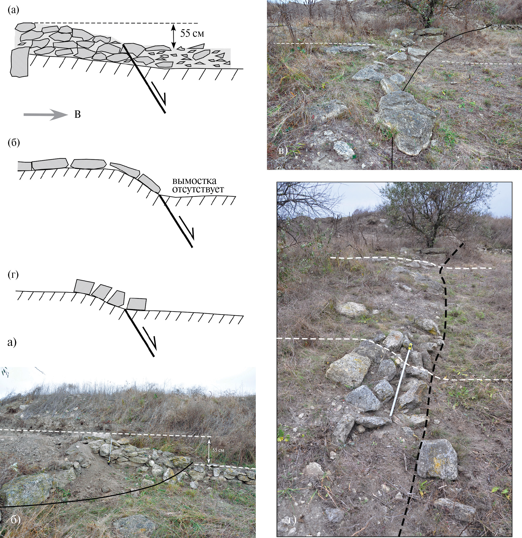 а – схематическая зарисовка (план); б – кажущееся смещение верхнего ряда каменной кладки субширотной стены Южно-Чурубашского городища к востоку от флексуры (см. рис. 2в для локации). В действительности сместились грунт (материк) и нижний ряд кладки на юг, а верхний ряд “остался на месте”; в – аналогичное смещение (только на юг) верхнего ряда каменной кладки к западу от флексуры.