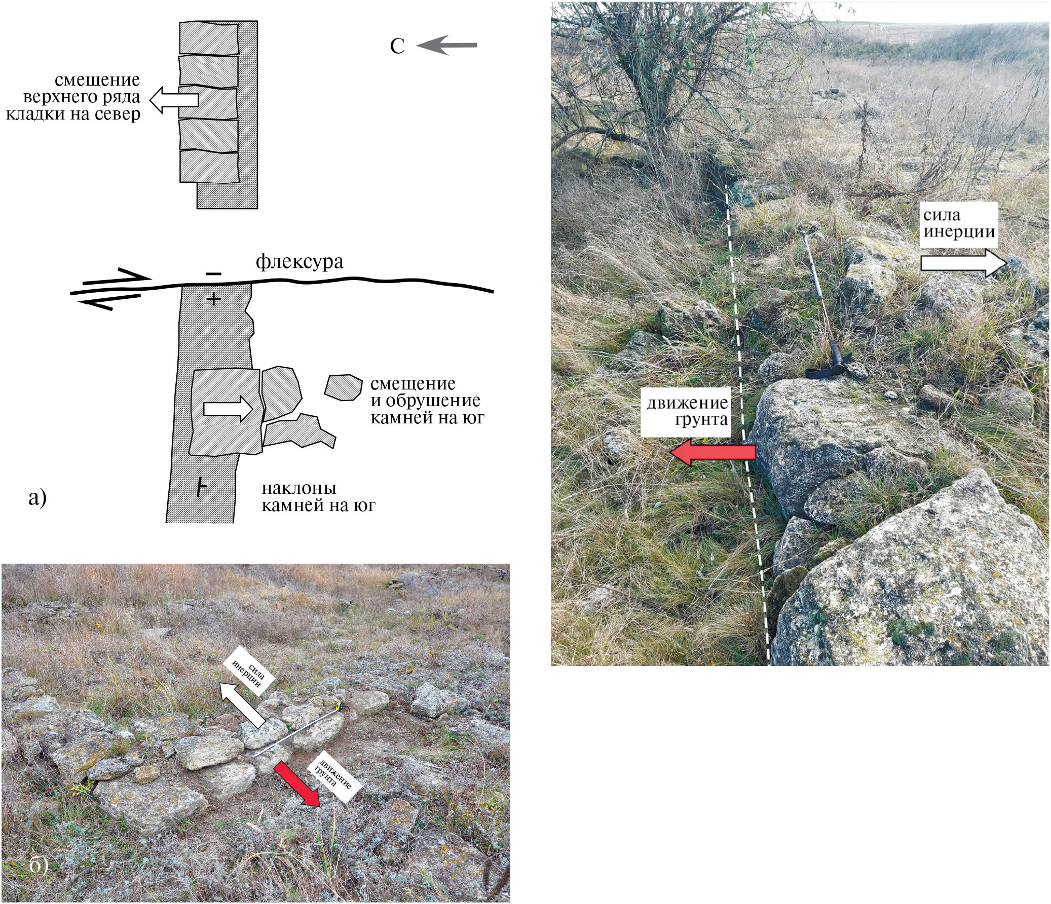 Аналогичное кажущееся смещение было отмечено нами к западу от флексуры (см. рис. 2в, 4а, 4в). Здесь небольшой фрагмент каменной кладки из верхнего ряда сместился на юг. Здесь видно также обрушение камней в том же направлении и наклон камней нижнего рада кладки все также на юг. Описанные деформации каменных кладок по обе стороны от флексуры могут означать не только вертикальное, но и небольшое (десяток см?) латеральное – правостороннее смещение вдоль структуры.