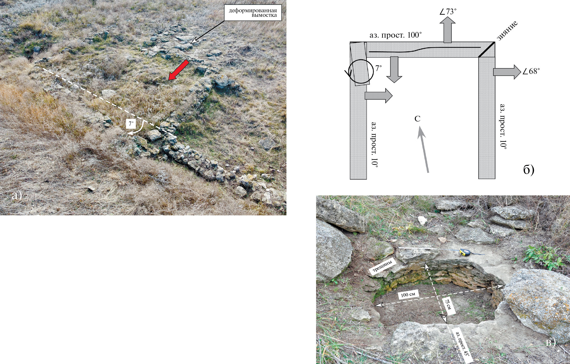 В 6 м на восток от описанной структуры имеется широтная стена (точнее, ее остатки) с азимутом простирания 95°. От стены сохранилась лишь 2 нижних ряда кладки (см. рис. 2в, рис. 4а, 4б). При этом весь верхний ряд выдвинулся на север по азимуту 5°. Ширина стены 70 см (по верхнему ряду). Ширина образовавшейся полочки от 12 до 23 см. Ширина полочки увеличивается в западном направлении. Чтобы создать такую деформацию, необходимо резкое смещение грунта в южном направлении. Верхний же ряд кладки как бы остается на месте, создавая иллюзию своего смещения на север.