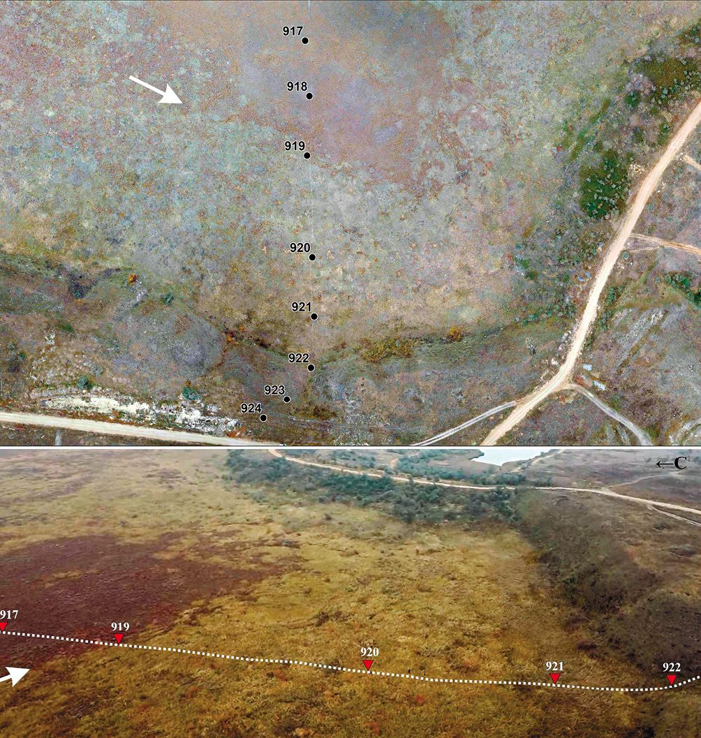 917–924 – пикеты георадарного профиля. Стрелками показан (вдоль простирания) пологий прямолинейный уступ на поверхности лагунно-морской террасы. В правой части перспективного фото расположен главный уступ.