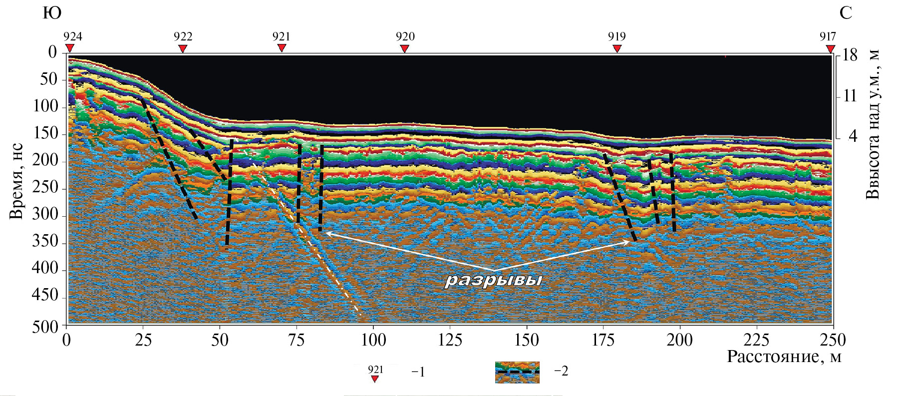 На полученном георадарном разрезе выявлены слои, нарушенные серией разрывов, которые соответствуют уступам в рельефе (рис. 8).