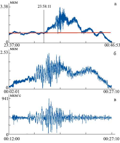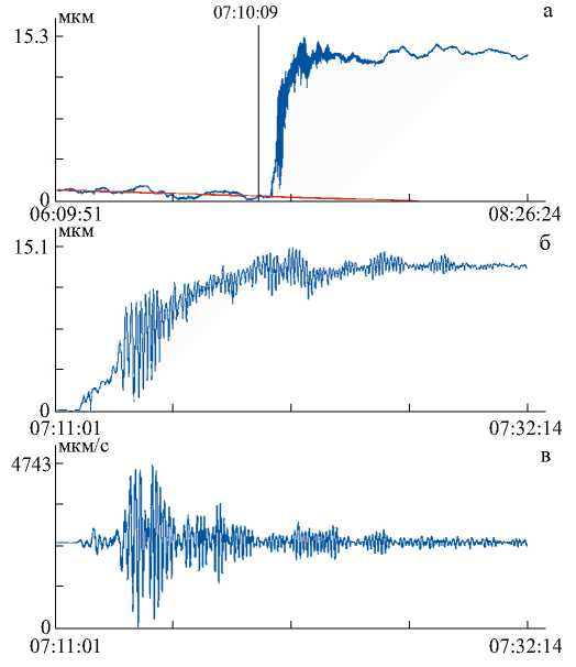 На рис. 3 приведены фрагменты записей лазерного деформографа и широкополосного сейсмометра. На рис. 3а представлен фрагмент записи лазерного деформографа длительностью 137 мин, а на рис. 3б представлен увеличенный фрагмент записи лазерно-интерференционного прибора в момент регистрации землетрясения, а на рис. 3в фрагмент записи широкополосного сейсмометра за тот же промежуток времени. Вертикальная линия на рис. 3а соответствует времени начала землетрясения. При анализе записи лазерного деформографа была выявлена деформационная аномалия, характерная для цунамигенных землетрясений (см. рис. 3а). Причем на записи широкополосного сейсмометра данная деформационная аномалия отсутствует. Величина этой аномалии составила 13.5 мкм.