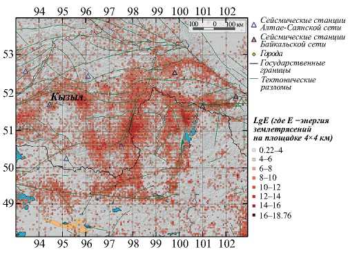 Рис. 5. Карта суммарной сейсмической энергии для блочной структуры Восточной Тувы и Западного Прибайкалья за 1905–2023 гг.