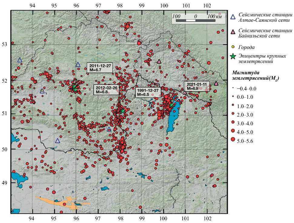 Ещё одним примером проявления высокой сейсмической активности в рассматриваемом регионе являются Тувинские землетрясения (27 декабря 2011 г., МL = 6.7 и 26 февраля 2012 г., МL = 6.8), произошедшие с интервалом в два месяца и сформировавшие общую афтершоковую область (рис. 10).