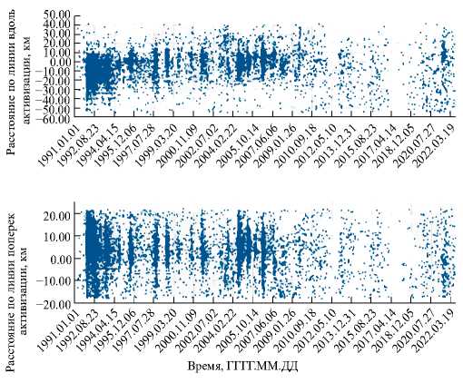 На рис. 9 представлено развитие сейсмического режима в очаговой области Бусингольского землетрясения 1991 г. с охватом периода афтершокового процесса Хубсугульского землетрясения 2021 г. Снос событий выполнен на линии вдоль и поперек перпендикуляров на рис. 7 в рамках прямоугольника. Следует отметить, что примерно в 2009 г. произошло изменение режима сейсмичности очаговой области. Район по-прежнему характеризуется высокой сейсмичностью, но кратковременные пульсации активности прекратились. Повышенная активность сменяется более спокойными периодами, при этом протяженность их сопоставима.