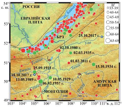 Кружками зеленого цвета обозначены эпицентры землетрясений исторического и раннеинструментального периода (1900–1959 гг., MLH ≥5.0) по данным [Новый…, 1977], красного – эпицентры землетрясений инструментального периода сейсмологических наблюдений (1960–2017 гг., Mw ≥3.5) по данным Байкальского филиала ФИЦ ЕГС РАН. Моментные магнитуды Mw, в случае отсутствия прямых определений, приведены по данным каталога ISC-GEM [Storchak et al., 2015; Di Giacomo et al., 2015] или рассчитаны по значениям энергетического класса КР [Rautian et al., 2007] с использованием соотношения из работы [Середкина, Гилева, 2016]. Ромбами обозначены сейсмодислокации в зоне Хамбинского (1) и Чикойского (2) разломов. Синие кружки со звездочкой означают эпицентры рассматриваемых землетрясений. Красной пунктирной линией обозначена граница между Евразийской и Амурской литосферными плитами, по [Bird, 2003].
