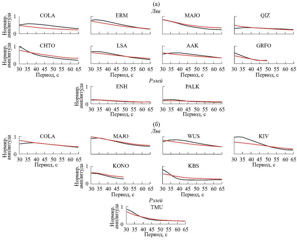 Амплитудные спектры поверхностных волн определялись с помощью метода спектрально-временного анализа (СВАН) [Левшин и др., 1986], представляющего собой аналог многоканальной узкополосной фильтрации. Диапазон периодов, в котором поверхностные волны выделялись наиболее надежно, подбирался для каждой станции отдельно. Для большинства станций он составил 30–65 с, за исключением станции GRFO для первого землетрясения и KONO для второго, на которых фильтрация была выполнена в более узком диапазоне – 30–50 с. Примеры исходных и отфильтрованных записей, а также соответствующие СВАН-диаграммы LHT-компоненты станции MAJO приведены на рис. 3б, 3в, 3г.