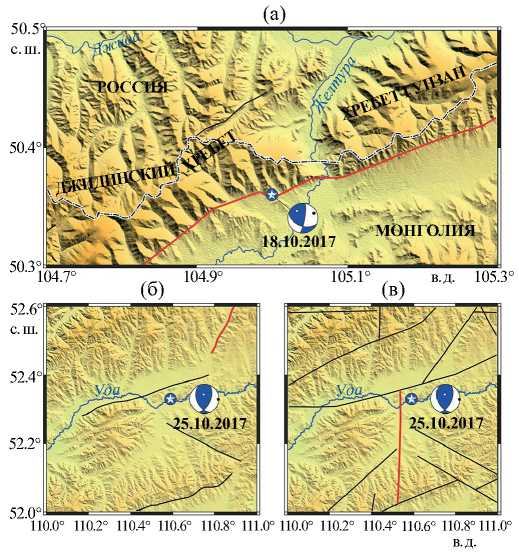 Эпицентр землетрясения 18.10.2017 г. расположен на территории Монголии, на южном склоне Джидинского хребта, в районе его северо-восточного окончания. Вдоль южного борта хребта трассируется региональный разлом, обозначенный как Джида-Дээлтэрийнский на карте [Лунина, 2016] или как Тэс-Селенгинский в работе [Zelenin et al., 2022] (рис. 7а). Разлом имеет в основном северо-восточное простирание, однако некоторые его небольшие по протяженности сегменты характеризуются субширотной или даже восток–юго-восточной ориентацией. К одному из таких сегментов, простирание которого варьируется, по разным данным, от 97° [Zelenin et al., 2022] до 117° [Лунина, 2016], пространственно приурочен очаг землетрясения 18.10.2017 г. Отметим, что простирание одной из нодальных плоскостей (NP2) в решении механизма очага составляет STK = 111° (см. рис. 4), что в целом хорошо согласуется с параметрами этого участка разлома. Следовательно, в данном случае мы можем достаточно уверенно предполагать проявление сейсмической активности фрагмента Тэс-Селенгинского (Джида-Дээлтэрийнского) разлома.