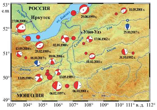Для впадины оз. Байкал показаны только сильнейшие события, для территории Западного Забайкалья – все землетрясения, для которых имеются решения механизмов очагов за указанный период. Механизмы очагов в проекции нижней полусферы приведены по работам [Solonenko et al., 1997; Середкина, Мельникова, 2014; Melnikova et al., 2017].