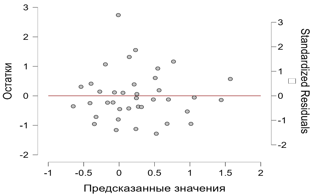 Рис. 2. Зависимость остатков регрессионной модели 1 от предсказанных стандартизированных значений