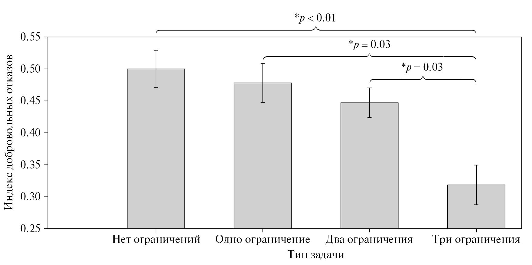Сравнения по критерию Шеффе продемонстрировали достоверные различия между индексами решения задач без ограничений и задач с тремя ограничениями (p < 0.001), индексами решения задач с одним ограничением и задач с тремя ограничениями (p = 0.041), индексами решения задач с двумя ограничениями и задач с тремя ограничениями (р = 0.042) (рис. 2).