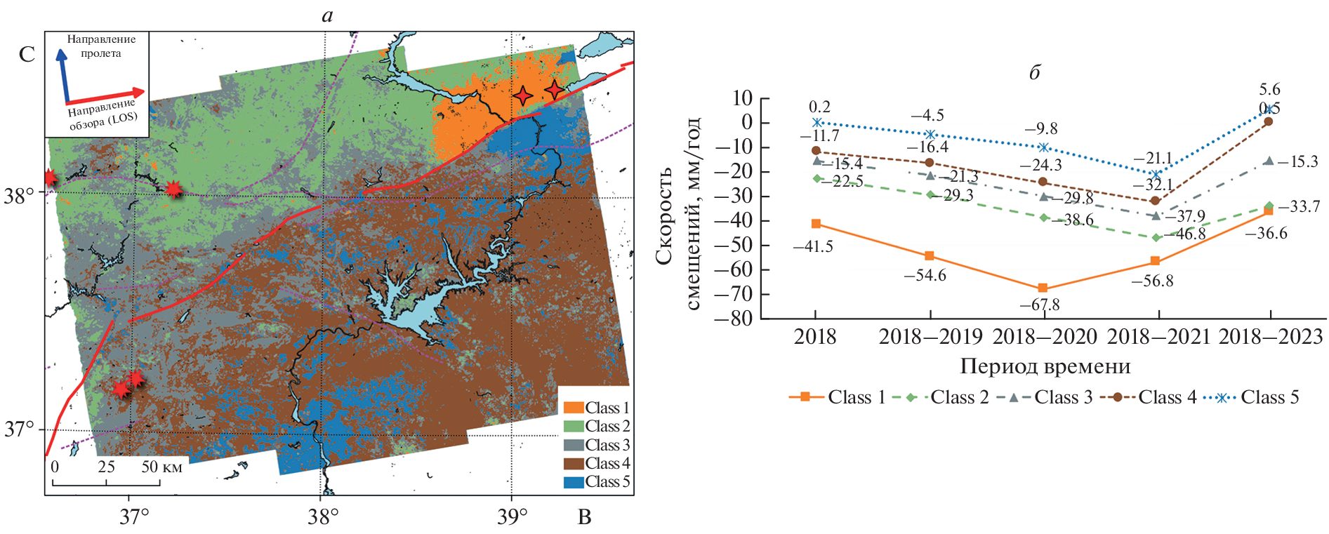 Displacement velocity fields of the block-fault structure are constructed and the main geodynamic processes in the area of the East Anatolian fault are revealed based on the results of processing of 437 radar interferograms obtained from the Sentinel-1 radar in the period from the beginning of 2018 to disastrous seismic activity in February 2023 in Turkey by Stacking InSAR method. Anomalous block displacements along this fault have been identified, which are timed to the earthquake of January 24, 2020 (M = 6.7). Zones of stress-strain state of the main blocks in the period preceding the earthquake have been established using cluster analysis of time series of velocity fields. It is shown that the epicenters of February 2023 earthquakes are located in these zones. It is concluded that it is necessary to use such a technique to assess the stress-strain state in order to predict seismic activity.