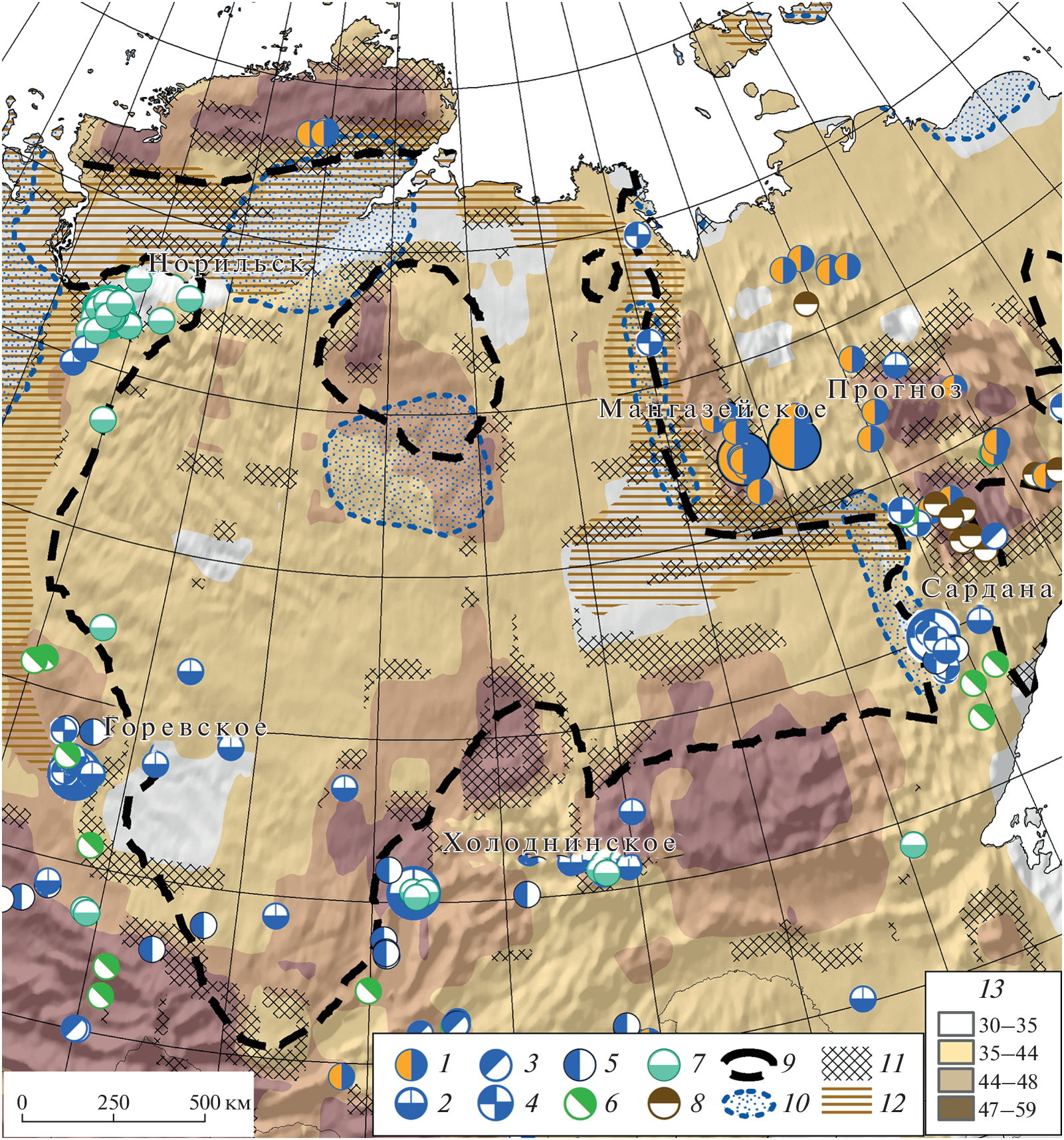The results of recent study of the Earth’s crust based on the gravity data of the GOCE satellite were used for a comparative metallogenic analysis of the geodynamic settings of polymetallic deposits in the folded frame of Siberian and East European platforms. It is shown that deposits of the SEDEX type are more often located in the earth’s crust with the predominant development of the lower “basalt” layer. Pyrite copper and lead-zinc deposits (VMS), as well as some occurrences of the SEDEX type, are known in subduction island-arc and accretionary settings on the crust with the predominant development of the middle “granite” layer. Pb–Zn ores of the MVT-type are localized in deep pericratonic sedimentary oil&gas basins on the shelf and continental slope, with no spatial relationship with the stratification of the earth’s crust. The Ag-polymetallic mineralization of Taimyr and Western Verkhoyansk are confined to deep pericratonic rift troughs on the passive continental margin, have a similar ore-bearing environment and may be considered as a single silver-polymetallic Taimyr-West Verkhoyansk belt. The obtained results to confirm the prospects of Pb–Zn deposits in Central and Eastern Taimyr, as well as the Saurey ore region (Polar Urals) and the need for their further research.