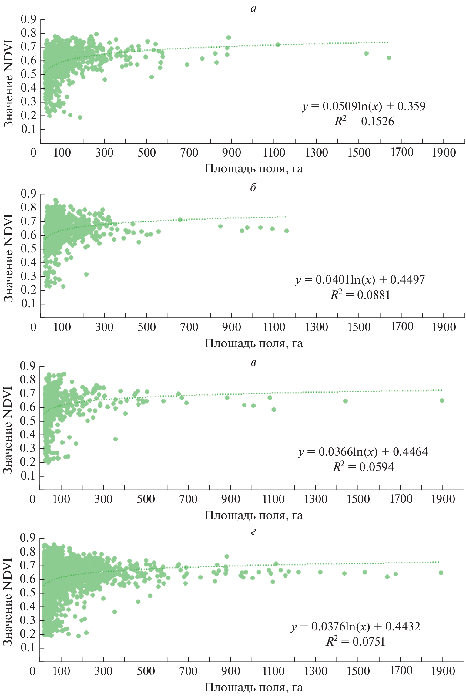 In total, 7.444 fields with a total area of 857.9 thousand hectares were mapped on the territory of five eastern arid regions of the Stavropol Territory. As of 2021, arable land occupies more than 55% of the study area and is located mainly in its western part. Winter crops occupy 4.693 fields with a total area of more than 487 thousand hectares (56.9% of the total field area). Mapping of the contours of the fields was carried out on the basis of satellite images “Sentinel-2” (“natural colors”). The morphometric characteristics of the fields were calculated on the basis of the SRTM3 DEM. Mask of winter crops for the period 2011–2021 and weekly composites with data on the NDVI value for spring (March–May) were obtained using the Vega-Science service. The areas of the fields identified according to remote sensing data are comparable with official statistics. The fields are located on lands with a steepness of up to 5°, the steepness of 1°–2° prevails (about 90% of the total area). Most fields have a predominant southern exposure, there are no fields with a northern exposure. There are 13 kinds of soils on the territory of the study area, chestnut deep soils predominate. Average NDVI for March–May 2011–2021 It shows the highest values in fields located on meadow soils, the lowest NDVI values are observed on salt flats and salt marshes. It was revealed that the NDVI value decreases with increasing field size, the optimal field size is up to 150 hectares. The highest NDVI values were found in fields with a steepness of 1°–2°, southern exposure and meadow, chestnut and light chestnut soils. The influence of annual precipitation amounts on the NDVI value is analyzed.