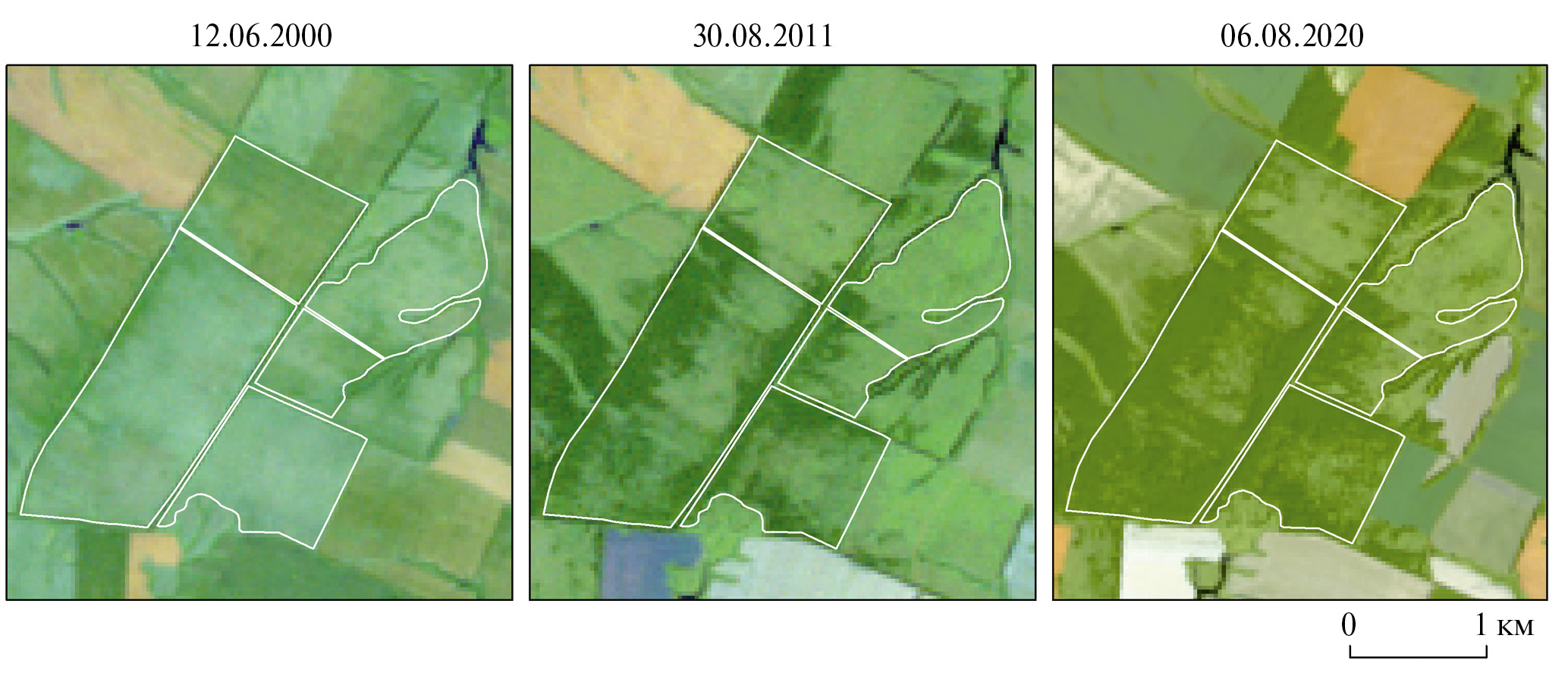 Формирование сомкнутых лесных насаждений достаточно выражено проявляется на многозональных космических снимках при анализе одиночных и разновременных изображений (рис. 2). В северной лесостепи этот процесс протекает достаточно интенсивно и за период порядка двух десятилетий, следующих после прекращения аграрного использования, на многих участках залежей успевают сформироваться сомкнутые лесные насаждения.
