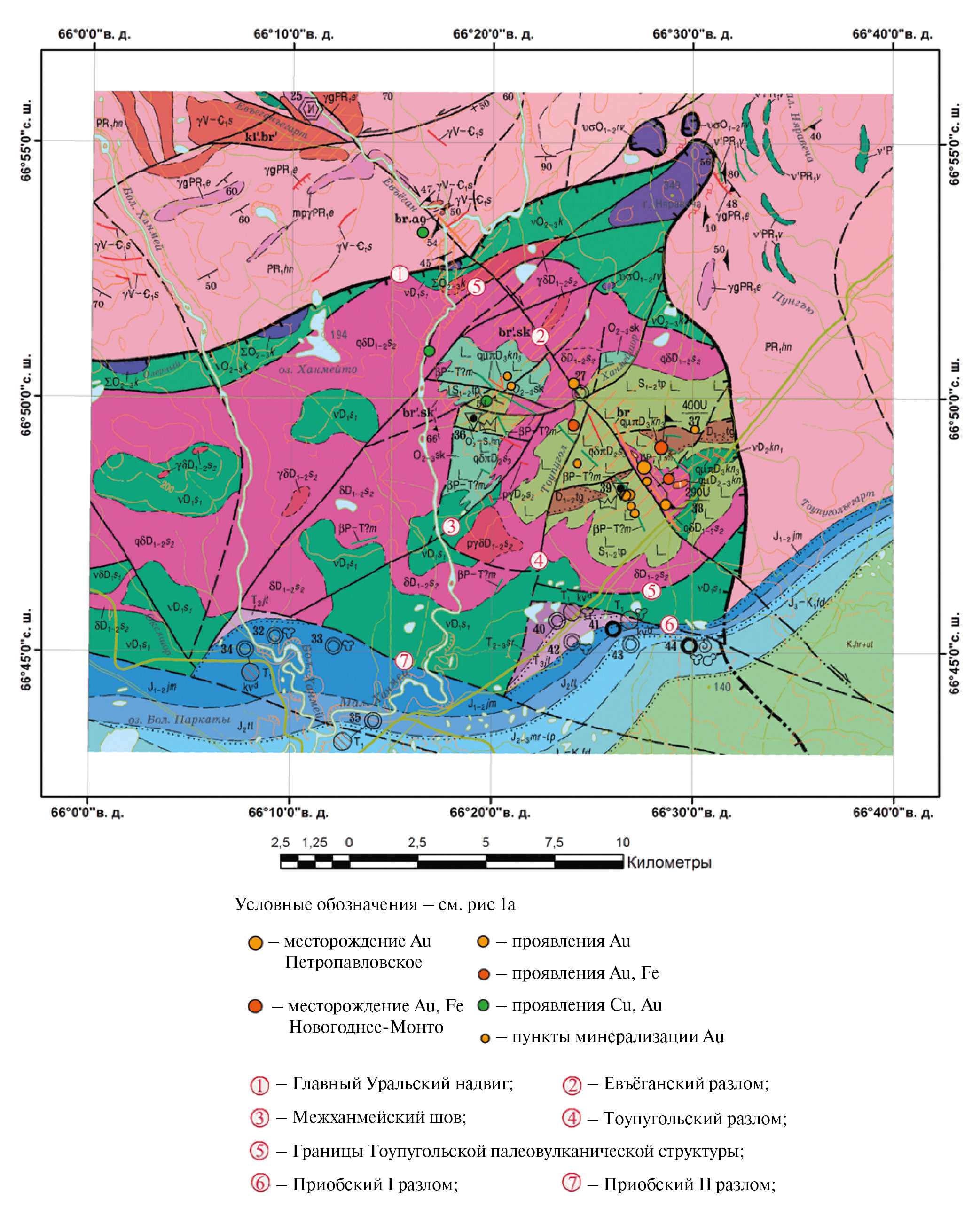 В пределах исследуемого района выделяются дизъюнктивные структуры первого (Главный Уральский надвиг) и второго (Евъёганский, Межханмейский, Тоупугольский, Приобский и др.) ранга. Разломы второго ранга подразделяются на северо-западные, субмеридиональные, северо-восточные и субширотные. Разломы северо-западного и северо-восточного направлений были заложены в допалеозойское время и активизированы в мезозое (Государственная…, 2014). Их отличительная особенность – протяженность и прямолинейность в плане, секущий характер по отношению к границам структурно-формационных зон. В плане это зоны шириной от нескольких десятков до сотен метров со сложным внутренним строением. Тоупугольскую палеовулканическую структуру контролируют северо-восточные, северо-западные и субширотные разломы сдвиго-сбросовой морфологии с достаточно крутыми падениями сместителей (55°–75°). Они представлены как системой одиночных швов, так и зонами повышенной трещиноватости с глинкой трения и элементами милонитизации. Дизъюнктивы более высоких порядков имеют различную направленность и представлены сбросами, сдвигами, надвигами либо их комбинациями. Они совместно со структурами первого и второго порядков создают исключительно сложный блоковый рисунок. Как правило, эти структуры сопровождаются зонами дробления, катаклаза и рассланцевания.