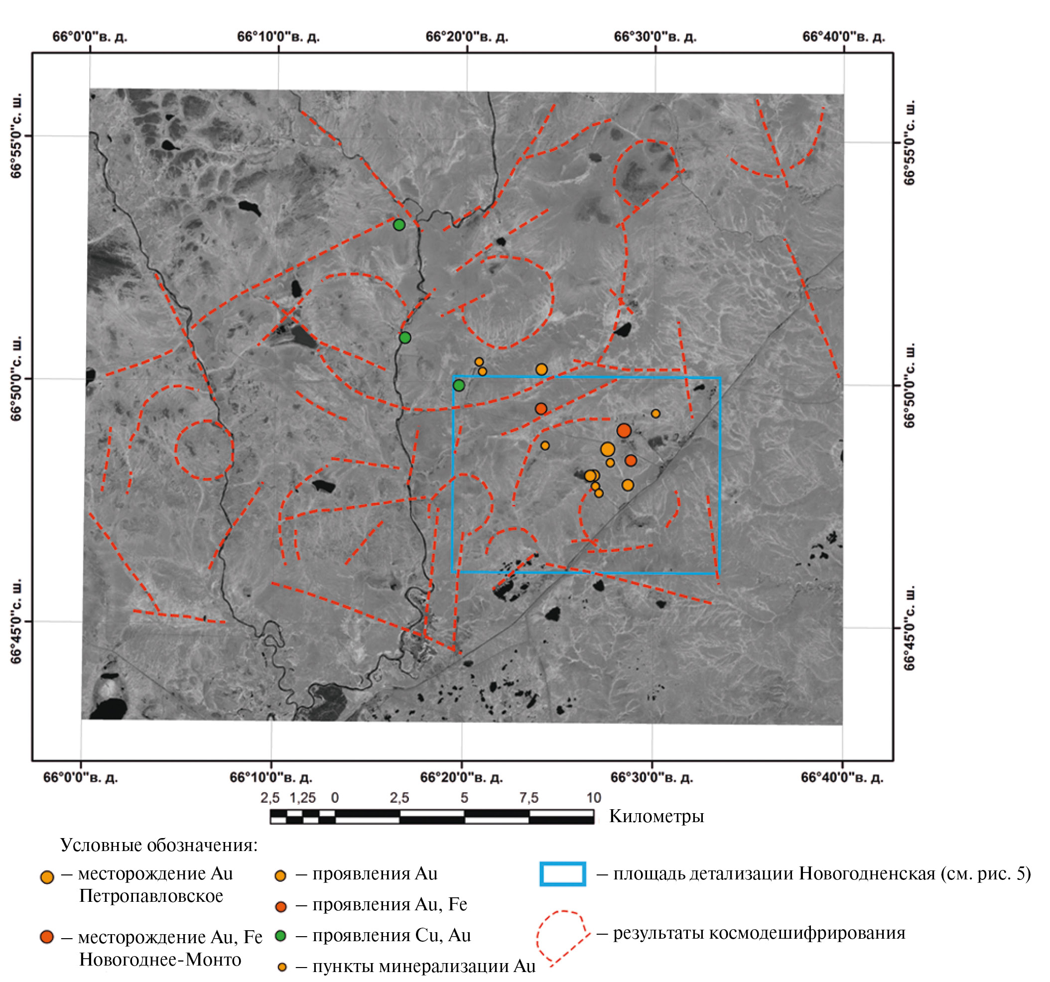 Детализация Новогодненской площади (рис. 5) с месторождениями Новогоднее-Монто и Петропавловское позволяет рассматривать Тоупугольский разлом как дуговую структуру, ограничивающую с запада выявленную при космодешифрировании Петропавловскую кольцевую структуру, в пределах которой расположено Новогодненское рудное поле.