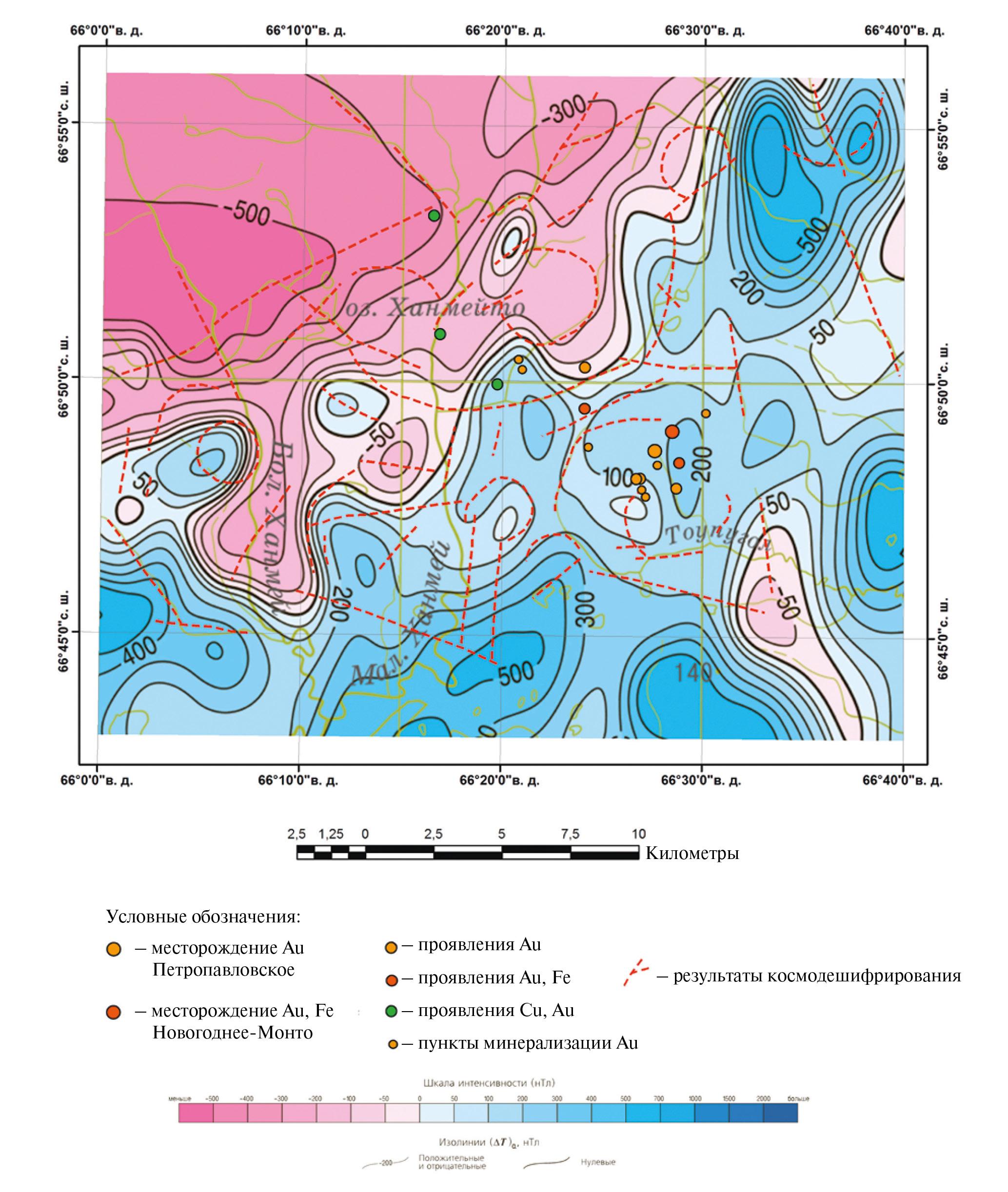 В магнитном поле эти две кольцевые структуры, обозначим их как Петропавловская и Ханмейшорская, существенно различаются. Значения магнитного поля Петропавловской структуры варьируют в пределах +50 ÷ +200 нТл (рис. 3), к этой структуре относятся 80 % золоторудных объектов, включая месторождения Петропавловское и Новогоднее-Монто. Ханмейшорская кольцевая структура расположена в области отрицательных значений магнитного поля, только в южной ее части, где развиты вулканиты соколинской свиты, отмечены положительные значения магнитного поля. Гравитационное поле в узком интервале значений +30 ÷ +35 мГал отличает более 90 % золоторудных объектов исследуемой площади (рис. 4). Петропавловская и Ханмейшорская кольцевые структуры характеризуются значениями гравитационного поля +25 ÷ +40 мГал.