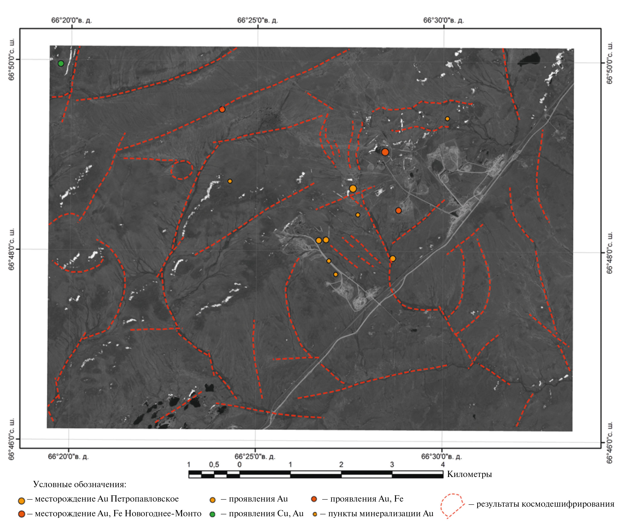 Дешифрирование структур Новогодненского района (рис. 2) выявило ряд существенных различий с результатами геологической съемки. С одной стороны, пространственное положение Главного Уральского надвига и Приобских разломов по данным космодешифрирования и геокартирования в существенной степени совпадает, за исключением сдвиговых деформаций Главного Уральского надвига по разломам северо-западного простирания. Вместе с тем, в строении Северо-Войкарского блока, образованного магматитами собского и конгорского комплексов, а также ордовик-силурийскими вулканогенными образованиями по данным космодешифрирования выявлен ряд новых элементов: большим развитием пользуются кольцевые структуры второго ранга (2–5 км); не наблюдается сквозного трассирования Евъёганского разлома через Тоупугольскую палеовулканическую структуру, в пределах которой отдешифрированы разломы восток-северо-восточного простирания; установлены многочисленные дуговые разломы, развитые в поле развития магматитов собского комплекса. По данным космодешифрирования на площади, относимой к Тоупугольской палеовулканической структуре, можно выделить две кольцевые структуры, одна из которых сложена образованиями тоупугольской толщи (в северной части этой структуры расположено Новогодненское рудное поле), а другая представлена вулканогенно-осадочными образованиями соколинской и ханмейшорской толщ и магматитами преимущественно собского комплекса.