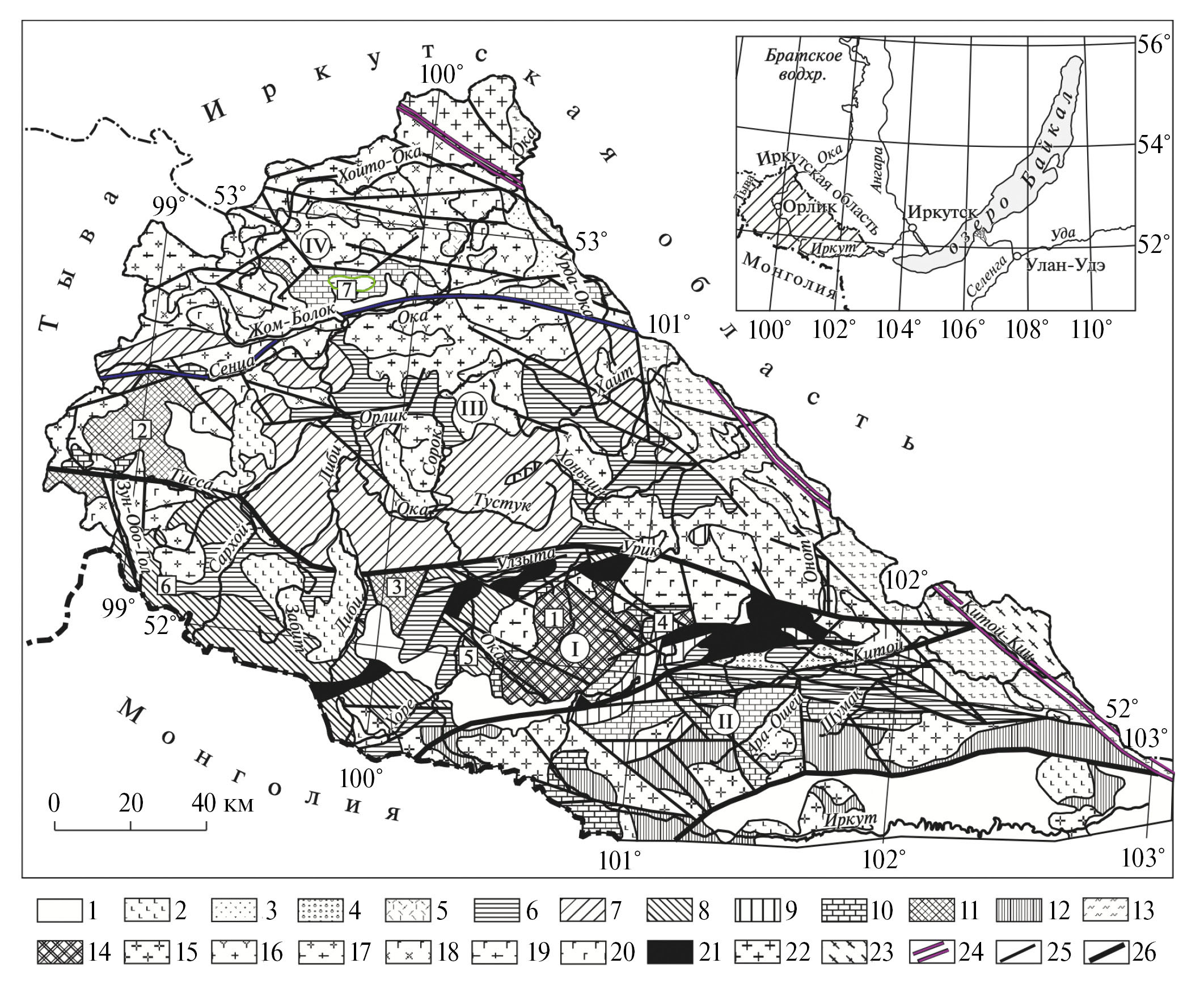 Структурно-формационные зоны: I – Гарганская, II – Ильчирская, III – Окинская, IV – Хойтоокинская (Хамсаринская). Условные обозначения: 1 – четвертичные отложения; 2 – неоген-четвертичные базальты; 3 – мезозойские осадочные образования нарингольской свиты (J1); 4 – конгломерато-песчаниковая сагансайрская свита (D–С1); 5 – вулканогенные образования илейской толщи (D1); 6 – боксонская серия нерасчлененная (PZ1); 7 – окинская серия нерасчлененная (PR3–PZ1); 8 – осадочно-вулканогенная сархойская толща нерасчлененная (PR3); 9 – терригенно-вулканогенные ильчирская и оспинская свиты (PR3); 10 – терригенно-карбонатная иркутная свита (PR3); 11 – метаморфиты Шутхулайской (2) и Хара-Тологойской (3) глыб (PR1); 12 – осадочно-метаморфические образования хангарульской серии (PR1); 13 – метаморфиты китойкинской серии (PR1); 14 – метаморфические и ультраметаморфические образования Гарганской глыбы (1) (AR2); 15 – верхнепалеозойские гранитоиды мункусардыкского комплекса (PZ3); 16 – гранитоиды огнитского комплекса (D1-2); 17–18 – таннуольский комплекс (Є3–Ο): 17 – тоналиты, плагиограниты, 18 – габбро, диориты, кварцевые диориты; 19 – габбро-тоналит-плагиогранитная серия сумсунурского (холбинского) комплекса (PR3); 20 – габброиды боксонского комплекса (PZ1); 21 – гипербазиты ильчирского комплекса (PR3); 22 – гранитоиды саянского комплекса (PR3); 23 – метагранитоиды китойского комплекса (PR1–2); 24 – зона Главного Саянского разлома; 25 – разрывные нарушения, преимущественно надвиги и сдвиги; 26 – границы структурно-формационных зон, синим выделен глубинный Жомболокский разлом. Глыбы: 1 – Гарганская, 2 – Шутхулайская, 3 – Хара-Тологойская. Вулканотектонические структуры: 4 – Барун-Холбинская, 5 – Верхнеокинская, 6 – Тисса-Сархойская, 7 – Хужирская, зеленым выделен Сайлагский массив, вмещающий Хужирское рудное поле.