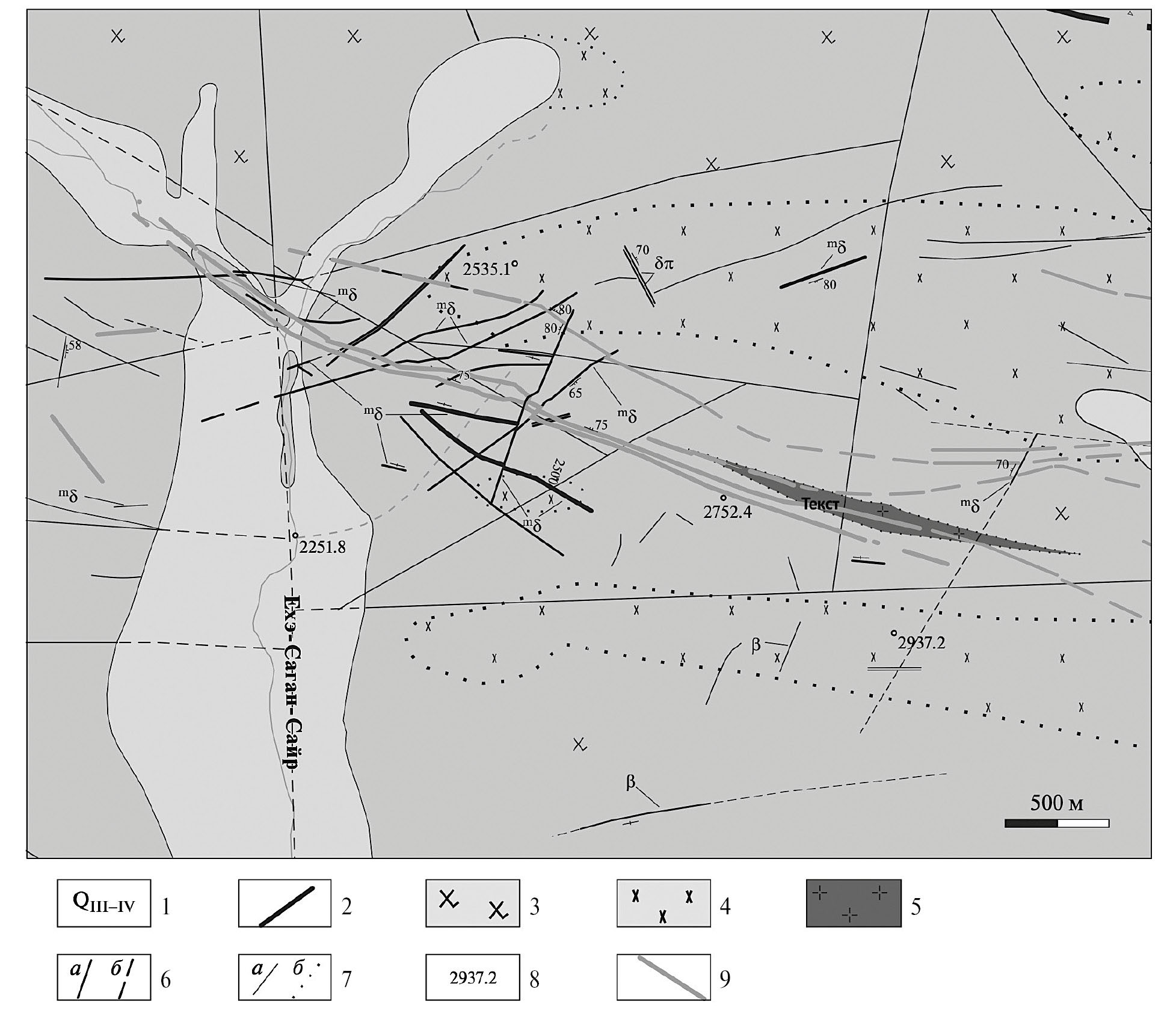 1 – четвертичные отложения нерасчлененные; 2 – дайки диабазов (β), диабазовых и диоритовых порфиритов (δπ), габбро-диоритов, микродиоритов (mδ); таннуольский комплекс, 1 фаза: 3 – гранодиориты, монцогранодиориты; 4 – диориты; 2 фаза: 5 – лейкократовые граниты; 6 – разрывные нарушения: а – установленные, б – предполагаемые; 7 – геологические границы: а – установленные, б – с постепенными переходами; 8 – высотные отметки; 9 – рудные тела – кварцевые жилы с зонами березитизации.