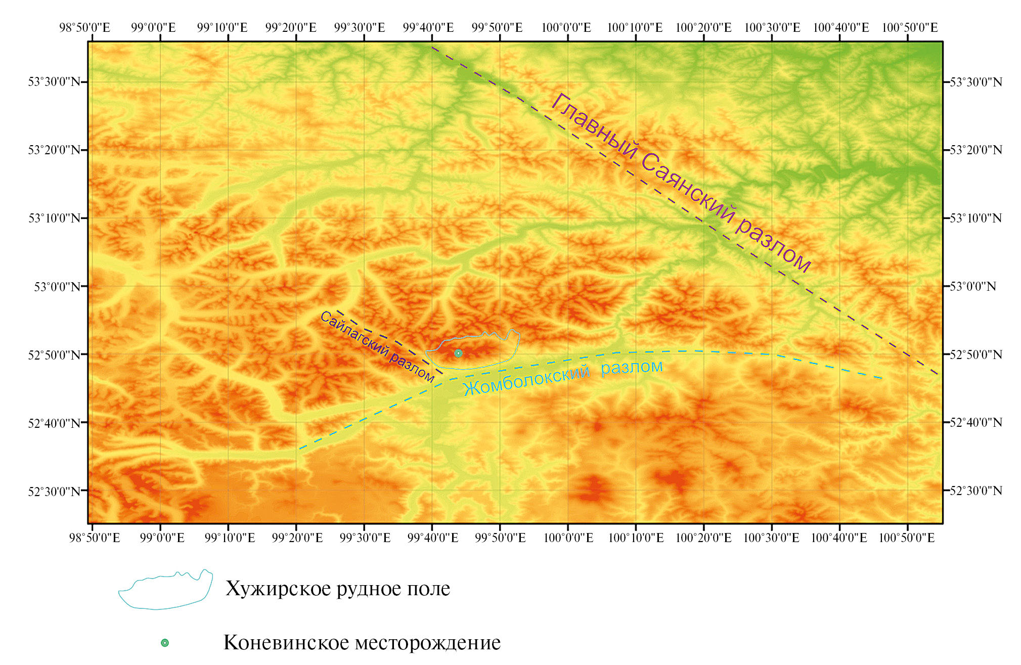 Структура Хужирского рудного поля определяется положением его в тектонических элементах юго-восточной части Восточного Саяна на стыке широтной Хамсаринской структурно-формационной зоны и ограничивающего ее с юга Жомболокского глубинного разлома, с главным Саянским разломом северо-западного простирания, ограничивающим Сибирскую платформу с юго-запада (рис. 1). Расстояние от Хужирского рудного поля до главного Саянского разлома 40 км; до Жомболокского – 8 км. Эти элементы определили простирание основных структур рудного поля. Единственным отрабатываемым месторождением в пределах Хужирского рудного поля является Коневинское золоторудное месторождение.