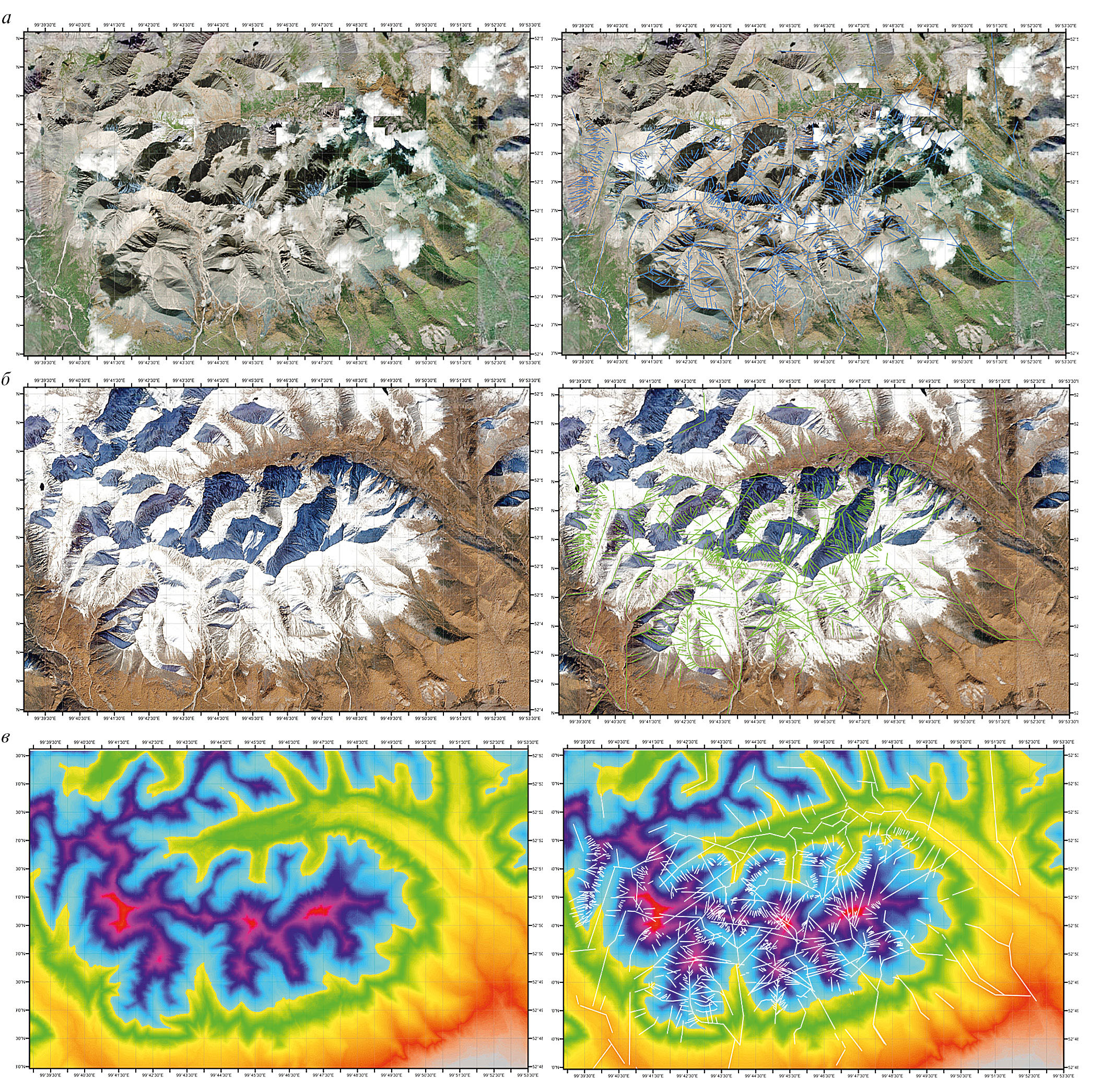 Рис. 4. Космические изображения (а – ESRI ArcGIS.Imagery, б – Yandex–Спутник, в – ASTER GDEM, слева) Хужирского рудного поля и схемы дешифровки линеаментов рабочей генерализации (справа).